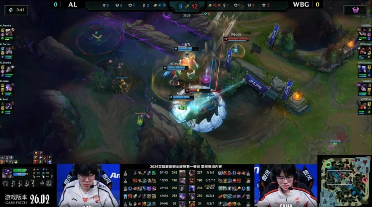 [25:40]中路团战,Tarzan波比锤飞WBG中辅,正面AL五打三,Flandre安蓓萨逮捕回到正面的Erha,Shanks发条闪现吃掉xiaohu人头,AL打出1换3,双方经济持平。