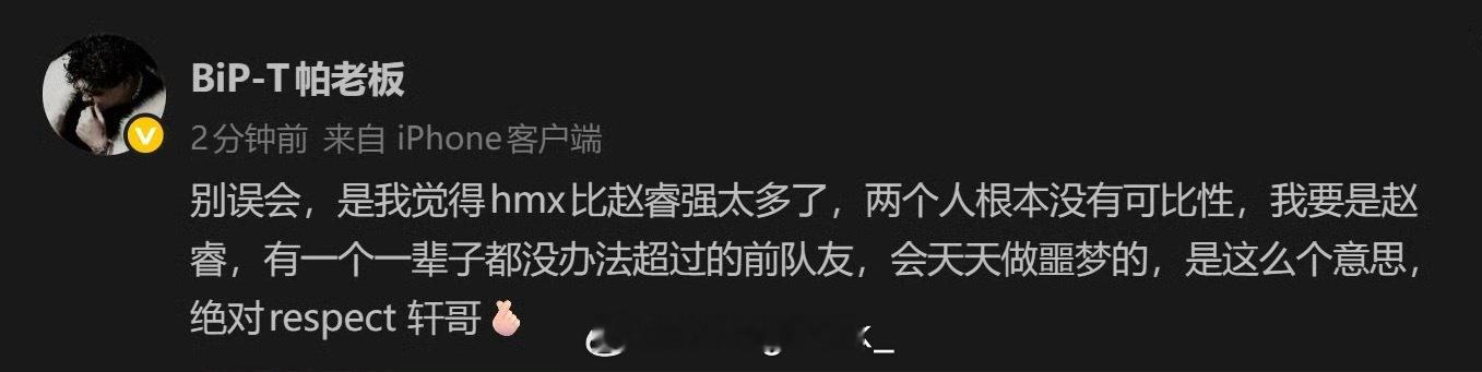 帕老板回应表示自己 是觉得胡明轩比赵睿强太多了,并且发文向胡明轩和其粉丝道歉!如果有人因此网暴胡明轩,希望大家想想是不是想转移注意力洗白某人