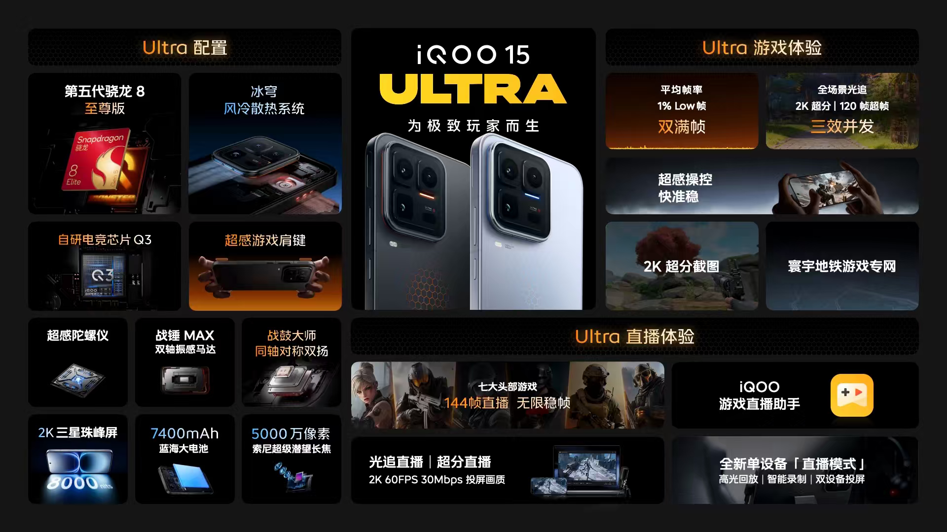 在今晚的发布会上,iQOO正式带来了iQOO 15 Ultra。这是iQOO首次在手机产品线上完整落地「性能Ultra」概念,从芯片、散热、屏幕到游戏生态,全面围绕重载游戏与高性能体验展开。