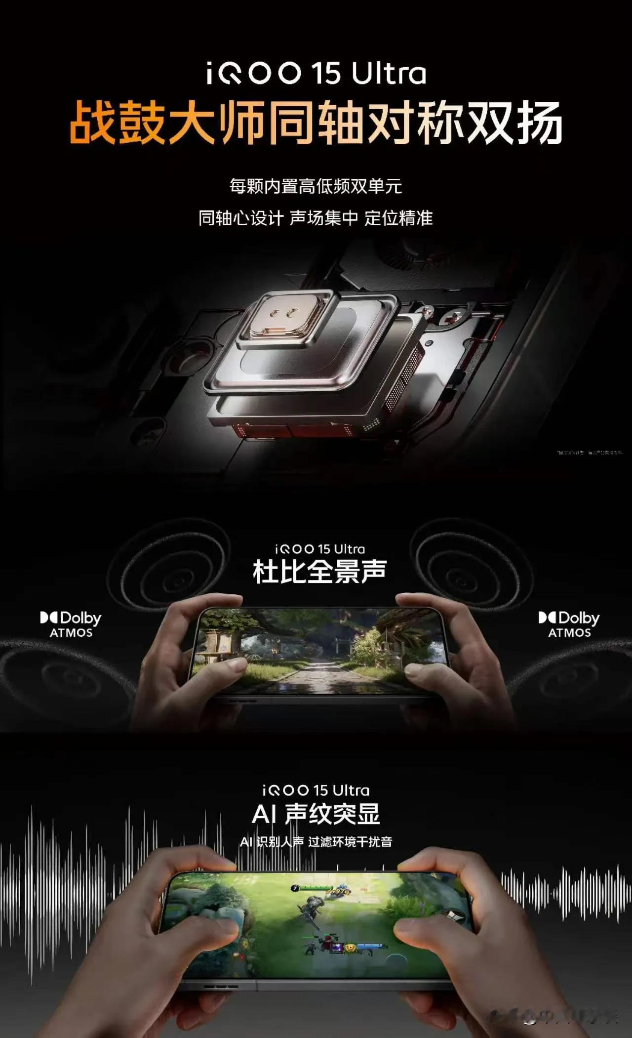 iQOO15 Ultra拥有全新战鼓大师同轴对称双扬声器:一颗扬声器同时内置高低频双单元,并将独立高音单元直接嵌入低音单元的中心;首次搭载杜比全景声,打造三维环绕声场;通过AI识别人声特征,精准屏蔽环境杂音。 战锤MAX双轴振感马达:576mm³的091640马达,强劲、有力、干脆;适配《开放世界手游》中24个角色的专属4D振感,新增22个双轴振动大招效果。 能量光刃:支持八大类通知,12种色彩调节;气氛光效能自定义颜色、速度、时长,以及设置拾音效果。 iQOO15 Ultra打造黄金直播体验: 超强直播体验:支持六大头部FPS游戏144帧直播无限稳帧,直播时的极限操作、高负载的团战、技能都可以丝滑流畅不卡顿;支持行业最高2K 60帧 30Mbps投屏画质,超分直播和光追直播让游戏直播画质再上一个台阶;双WLAN加速搭配 iQOO CAST私有协议,直播投屏更稳定。 iQOO游戏直播助手:连接操作简单便捷;支持专业直播音频通路管理、直播隐私保护;高光回放、智能录制、一键投屏开播等功能为主播助力。