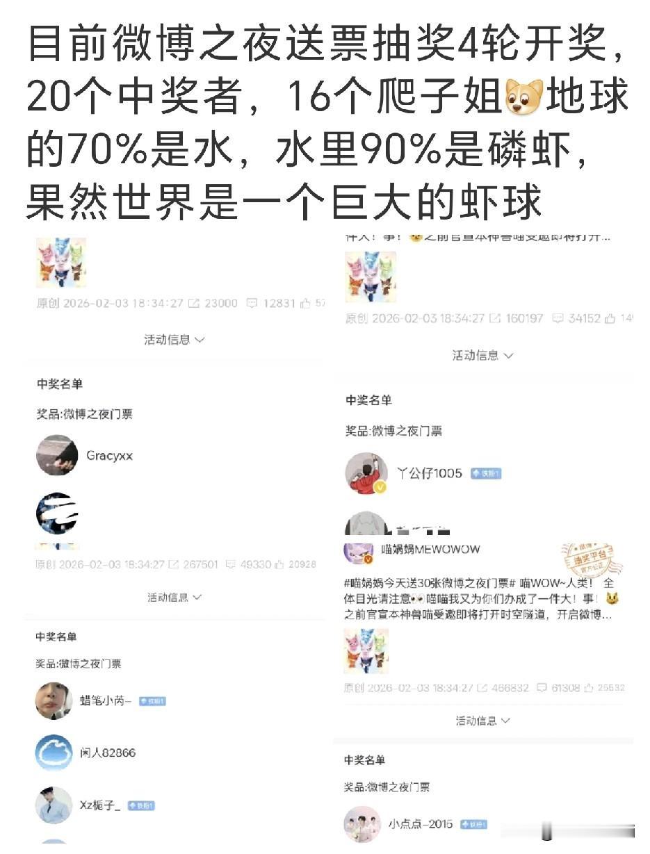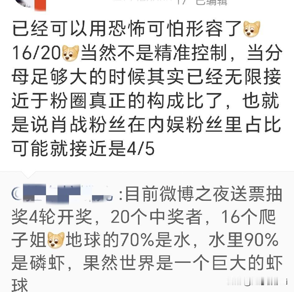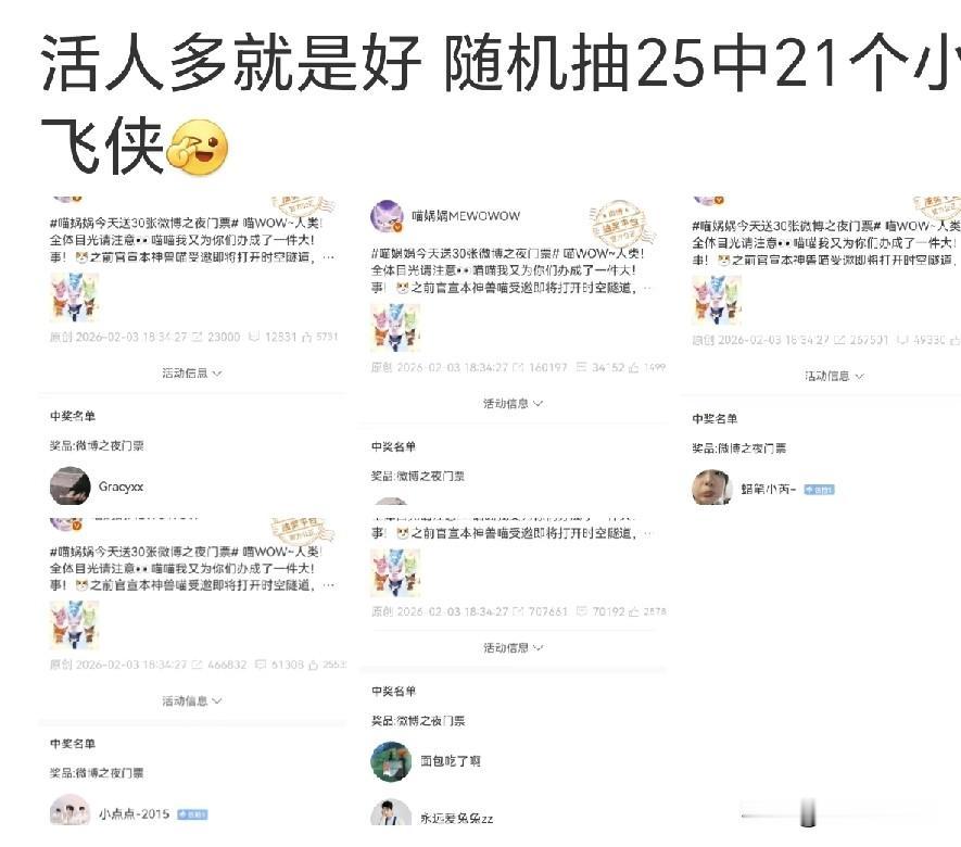 微博之夜评论区抽奖送门票,25张票,75万评论,肖战粉丝小飞侠被抽中21张,好恐怖,学过概率统计的人一眼就可以看懂,人数足够大,分母足够大,才有如此大的概率和中奖率啊 都说肖战粉丝多,但肖战微博粉丝在明星中并不是最多的,但活粉却是内娱最多的,这次看参与投票抽奖的活粉比例,肖战粉丝接近90%。跟前些年投票抽奖活粉比例统计大致相当,26年反而活粉更多了一些,因为25年考作品又吸引了许多活粉[赞] 肖战为什么叫断层顶流,因为有断层热度啊,业内都知道真实的数据,活粉和机器人僵尸粉,是有本质区别的,一到综合性的群星汇聚的时候,就可以一清二楚了,现场有一大半观众都是肖战粉丝,都是为肖战而来[加油] 所以肖战一直是大导大制作的首选,是因为肖战有真正的号召力,还有就是肖战有真正的实力,这样实力和超级流量兼具的巨星实属罕见