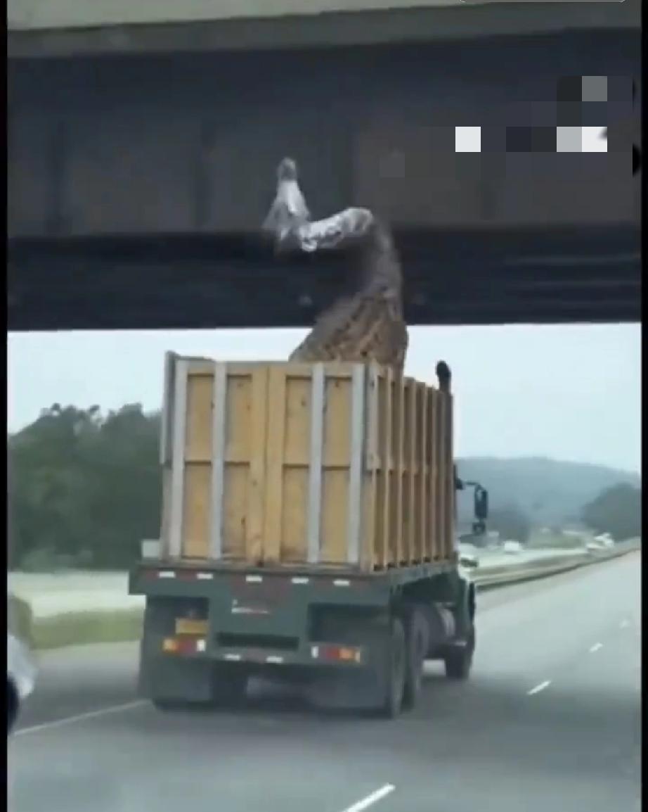 这只长颈鹿怕是没救了,这位货车司机估计是头一回接这类订单,路过大桥时丝毫没有安全意识,可怜的长颈鹿就这么没了性命。