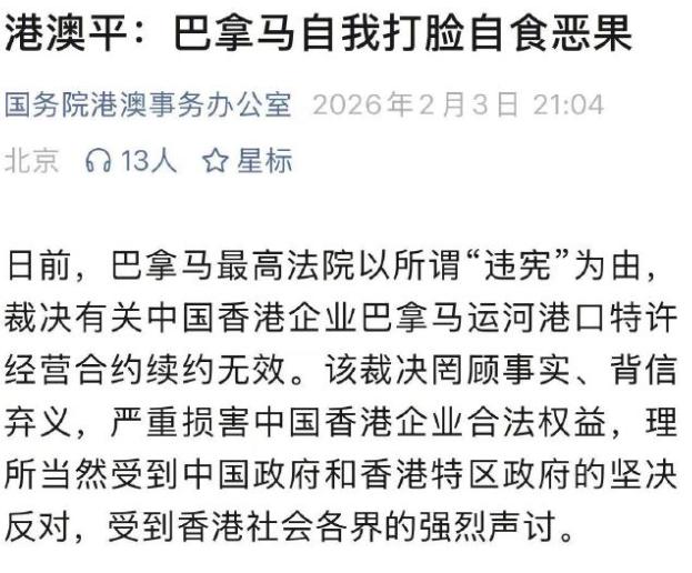 国务院港澳办重磅警告:中国有足够的手段和工具、足够的实力和能力维护国际经贸秩序公平公正。巴拿马当局应当认清形势、迷途知返。如果一意孤行,执迷不悟,必将在政治上、经济上都付出沉重代价。 说白了,巴拿马这是揣着明白装糊涂,拿鸡蛋碰石头,真当中国的底线是纸糊的,真以为背信弃义能换来好处,殊不知国务院港澳办这记重磅警告,就是最后的通牒,再不听话,必遭重罚! 最近巴拿马干的这事,说难听点就是自毁前程,好好的合作放着不做,非要跟着别人瞎起哄,单方面撕毁中国香港企业在巴拿马运河港口的特许经营合约,还找了个“违宪”的借口,明眼人都能看出来,这就是在测试中国的战略底线,就是想靠着牺牲中国的利益,去讨好别的国家。 我就想知道,如何让那些挑衅者,付出不可承受的代价,不管是之前的澳大利亚,还是现在的巴拿马,真当中国好欺负不成? 我感觉无论是澳大利亚还是巴拿马,都不能对中国这么做,真做了后果就会很严重。 澳大利亚之前跟着挑衅,最后在贸易上吃了多大的亏,全世界都看在眼里,巴拿马偏偏不长记性,非要重蹈覆辙,这不是傻是什么? 据说那家中国香港企业,在巴拿马经营港口快三十年了,累计投入得有十几亿美元,还给当地创造了上千个就业岗位,实打实的互利共赢,结果巴拿马倒好,一句“违宪”就想把人踢走,转头就找了别的企业来接管,这种背信弃义的操作,简直是把国际契约精神踩在脚下。 而且它必须清醒认识到,中国维护海外公民和企业合法权益的决心坚定不移,不是嘴上说说而已。 就拿大家能想到的来说,中国是巴拿马运河的第二大用户,据说每年通过运河的货物,有三分之一左右都和中国有关,光是缴纳的通行费,就占了巴拿马运河总收入的不小比例,这就是我们的底气之一。 对巴拿马的这一次背信弃义,一定要采取坚决果断的反击措施,牛刀杀鸡,杀鸡儆猴,让巴拿马肉疼不已,让其他国家不敢效仿。 其实不用多,就几招就够了,比如调整商船航线,减少通过巴拿马运河的货物,再比如依法对相关人员采取反制措施,支持企业索赔,这三招组合拳,招招切中要害,但中国能出手的招数可远不止这些,不过就这几下,估计就足以让这个中美洲小国为其短视与投机付出难以承受的代价。 而且我感觉,巴拿马这次的操作,不仅会得罪中国,还会让其他国家对它失去信任,毕竟连几十年的合作都能说撕就撕,以后谁还敢去那里投资?到时候资本外流、信用降级,受苦的还是巴拿马自己。 最后说一句,以上全是我个人看法,不代表任何官方立场,只是单纯看不惯这种挑衅行为。 大家觉得,中国应该拿出哪些具体措施,让巴拿马付出代价?欢迎在评论区留下你的看法。