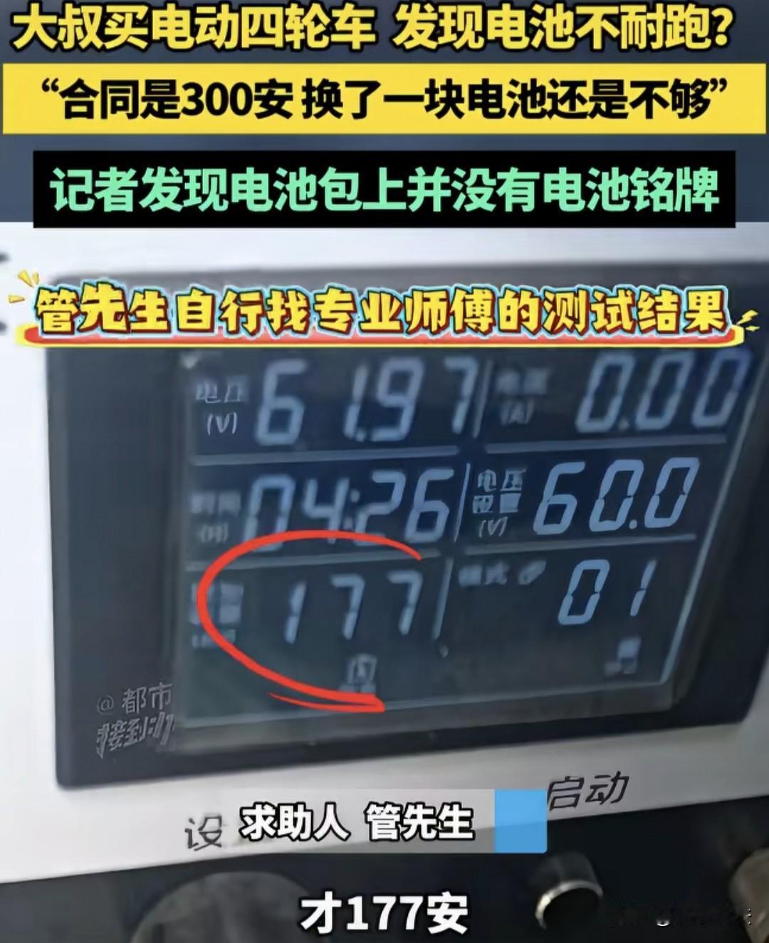 河南郑州,男子买了一电动四轮车,发现里程数达不到,他买的300安的电池,一检测只有177安,卖家给他换了一块电池后,再一测才200安,男子忍无可忍,再次找对方协商,对方表示可以返厂检测电池,并退赔9800元,谁料,对方趁男子不在场,对电池检测,拿出检测报告说符合300安。男子不解,我没在场你们私自检测,我不认可。当他问对方索要电池,想重新检测时。对方却说:电池被处理了。 管先生很无奈的说:“我被骗了两次,实在气得慌,当时说的好听,一不坑二不骗,结果,车买回家,里程达不到!” 原来,管先生买了一辆电动四轮车,合同上写的是300安,可是开回家之后,他发现车里程不够,就没电了。 于是,他找了一个懂行的师傅验证了一下,结果发现电池才177安。 这下,管先生明白了,合着电池不够,于是,他找卖车的老板说了一下这个情况。 这个老板倒也积极,立马给管先生发过去一个新的电瓶。 新电瓶到了之后,管先生费劲巴拉的找人安装上,试了里程后还是达不到,这次他有些气愤,这不是忽悠人嘛,当时说好的是300安,结果里程还是达不到。 于是,管先生再次找了之前的师傅给电瓶测试,测了之后,这次到不一样了,比之前多了一些,这次是200安。 管先生心里这个郁闷,买的新车,是按照300安买的,结果相差了100安,也差的太多了。 管先生猜测,老板可能觉得自己不会拆电瓶,也不会看,所以,老板给自己发的是缺斤少两的东西。而且,连着骗自己两次。 管先生这个生气,找了记者,拿着合同,找到当时买车的汽车厂。 对方问管先生跑了多少公里? 管先生老实的回答,第一次跑了150公里左右。 记者一看问题没说到根上,便提醒说,这不是跑多少公里的问题,是你们的电池达不到300安的标准。 工作人员带着他们看了电池。 记者发现电池上有一个牌,上面写着电瓶的基本详情,可管先生的电瓶上却没有。 工作人员表示不知道为什么。 随后,记者联系上了电瓶的厂家,对方回答电池出厂不一定有名铭牌,让他问买卖家。 然而,当问卖家的时候,对方一直不吭声,不回答。 后来,卖家表示,可以对电瓶重新检测,返厂检测。 因此,在记者的帮助下,管先生认为可以找个第三方机构来对电瓶进行检测,而且要在双方都在场,看看电瓶到底是多少安。 经过协商,老板和管先生商量,说可以给他更换一块电池,到管先生拒绝了。 管先生说,我要求假一赔三。 根据《消费者权益保护法》第55条,经营者提供商品有欺诈行为的,应当按照消费者的要求增加赔偿其受到的损失,增加赔偿的金额为消费者购买商品价款的三倍。 此事中,合同白纸黑字写着300安,实际交付却缩水严重,这已经不是简单的质量瑕疵,而是典型的“货不对板”。 商家更换了电池也达不到标准,显然主观上存在虚假宣传和欺瞒消费者的意图。 法律规定的“假一赔三”是针对这类不诚信行为的最强力约束,管先生的主张在法理上完全站得住脚。 之后,记者陪同管先生到了店里,管先生自己进去和卖家协商。 最终,双方都各退一步,卖家给管先生退了9800块钱,直接到账。 而至于电池到底有没有300安,商家说可以返厂检测,管先生将电池交给了对方,可万万没想到,对方做了一个令人气愤的举动。 之后,汽车厂负责人提供了两张电池检测照片,一张是电池二维码扫描的后台数据,另一张是电池厂家提供的证明,证明电池满足300安。 管先生对这个结果并不认可,因为给电池检测自己没在场,之后,厂家卖家检测认证的,自己肯定不能认可。 随后,记者又去了汽车厂打算找回管先生的电池,打算找正规的第三方渠道再次检测。 然而,记者问对方,电池在哪呢? 对方表示,电池已经被处理了。因为这种锂电池它里边的单独有个什么电芯,就是分容的话,他就拆开了…… 本来当初协商本是说好管先生和卖家都在厂的情况下,在进行检测,再出具证明。 如今,对方单方面出具的证明,无法证明其真实性。 然而,汽车厂负责人和记者表示,这事完美的解决了,客户也没有啥问题,我们也没有啥问题,咱们何必在纠缠下去呢? 当记者再次索要电池时,对方有些恼怒,表示电池不在自己手里。 这件事,虽然还有很多疑点,但最终也就这么地不了了之了。 这事儿最让人窝火的不是电池缩水,而是商家的那套“迷魂阵”。 更换电池却缺斤少两,说明老板根本没打算真诚解决问题,而是觉得老百姓好糊弄,指望能瞒天过海。 这种遮遮掩掩、糊弄了事的态度,不仅没清理好和消费者的矛盾,也违背了诚信经营的理念。 你怎么看呢?