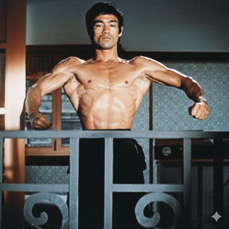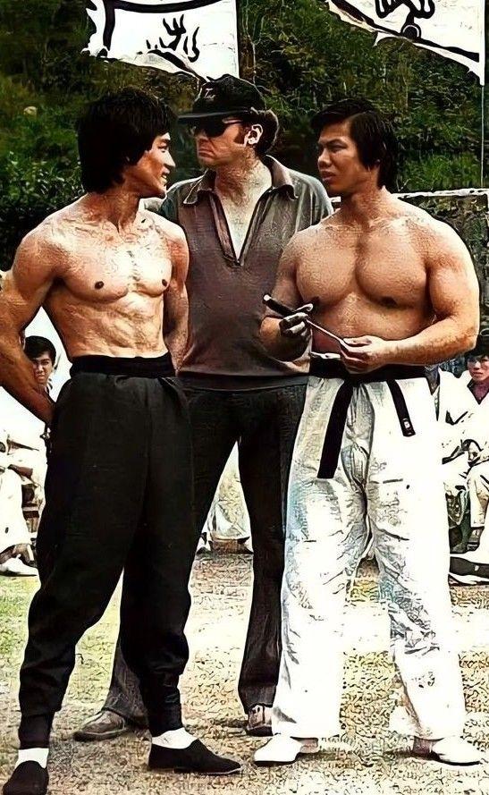 胳膊差一倍背却一样宽?这就是李小龙! 1973年,《龙争虎斗》拍摄现场,李小龙与健美先生杨斯并肩而立,二人的肌肉虽然风格不同却同样具有震撼力:杨斯走肌肥大路线,发达的胸肌和胳膊可以说是秒杀了李小龙,但是李小龙却有着足以与杨斯媲美的宽阔背阔肌,一身刀劈斧削般的肌肉,正是李小龙爆炸力量的源泉