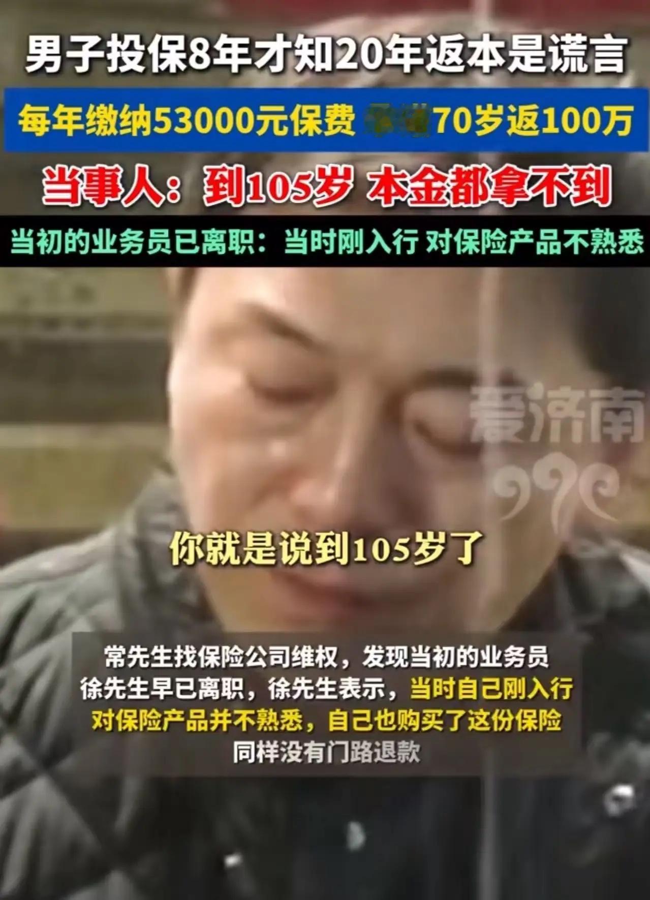 男子每年缴纳53000元保费,投保8年才知道20年返本是谎言!男子:“就算我活到105岁,连本金都拿不到!”当初的业务员:“已经离职,当时刚入行,对保险产品不熟悉。”网友:本来买保险是图保障,结果跟诈骗一样! 八年保费梦成空,“返本”承诺竟是谎 近日,一则保险纠纷事件引发社会广泛关注。一位男子每年缴纳高达53000元的保费,坚持投保8年后,却惊觉当初业务员承诺的“20年返本”竟是一场彻头彻尾的谎言,这一事件让众多网友对保险行业信任度大打折扣。 据这位男子讲述,8年前,一位保险业务员向他推销一款保险产品,声称只要连续缴纳20年保费,到期后不仅能全额返还本金,还能获得一笔可观的收益。在业务员的极力劝说下,男子考虑到为家庭增添一份保障,便咬牙购买了该保险,每年按时缴纳53000元保费,从未间断。 然而,8年过去了,男子偶然间深入研究保险条款,才发现事情远非业务员所说的那样。按照合同规定,即便他缴满20年保费,到期后也根本无法拿回本金,更别提所谓的收益了。男子愤怒地表示:“就算我活到105岁,连本金都拿不到!这和诈骗有什么区别?” 当男子联系当初的业务员时,得到的回复却让他更加心寒。业务员称自己已经离职,且当时刚入行,对保险产品并不熟悉,所以才给出了错误的信息。这样的解释显然无法让男子接受,他觉得自己被欺骗了,多年的辛苦钱可能就此打了水漂。 此事在网络上曝光后,引起了网友们的强烈共鸣。许多网友纷纷留言表示,本来买保险是为了图一份保障,结果却遭遇这样的糟心事,感觉就像被诈骗了一样。还有网友分享自己类似的经历,称保险行业的乱象丛生,让消费者防不胜防。 保险,本应是人们抵御风险的坚实后盾,是给予生活安全感的可靠保障。然而,这起事件却暴露出部分保险业务员为了业绩不择手段,虚假宣传误导消费者的问题。这不仅损害了消费者的利益,也严重影响了保险行业的声誉。 希望相关部门能够加强监管,严厉打击保险销售中的违规行为,规范市场秩序。同时,也提醒广大消费者在购买保险时,一定要仔细阅读合同条款,切勿轻信业务员的片面之词,避免陷入类似的陷阱。男子每年缴纳5300元保险保费 投保8年才知道20年返本是个谎言