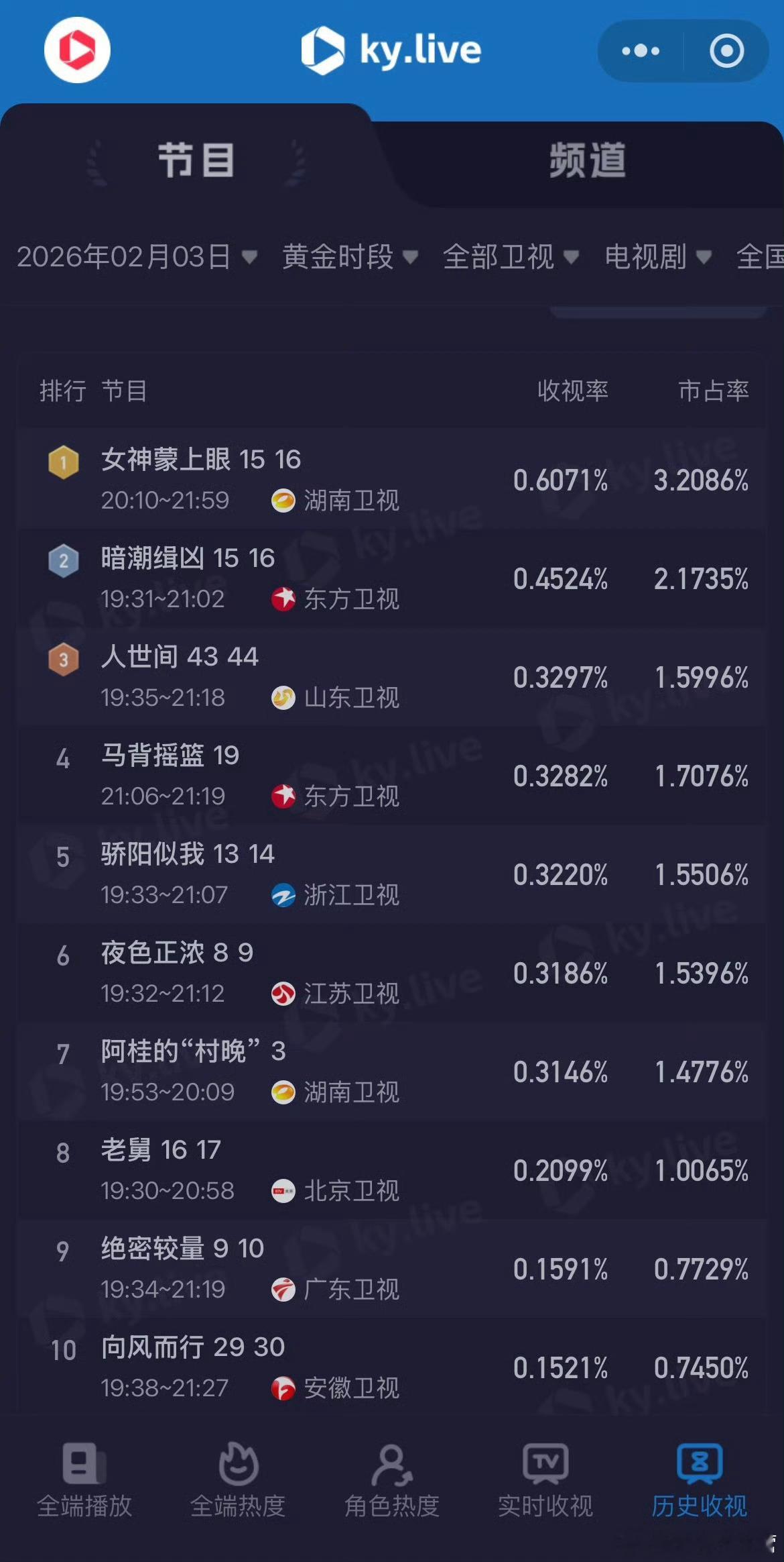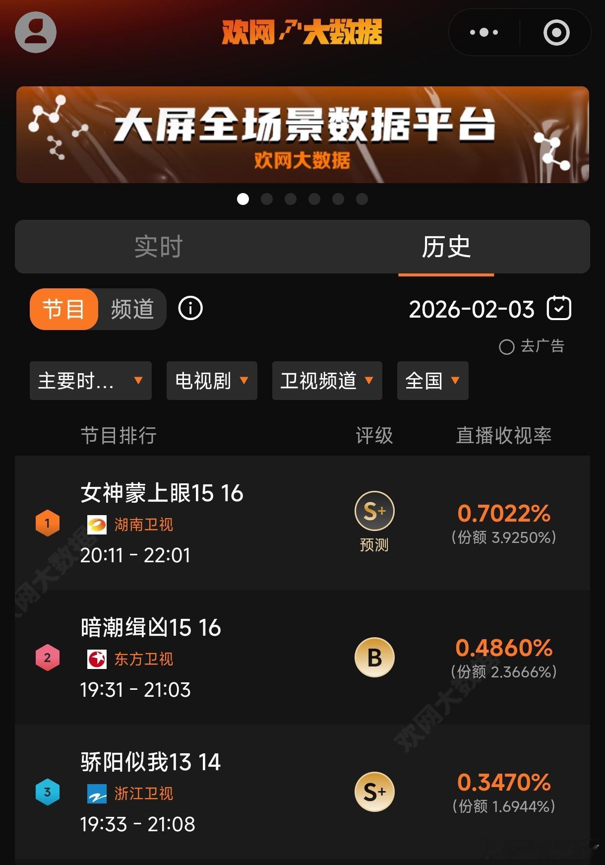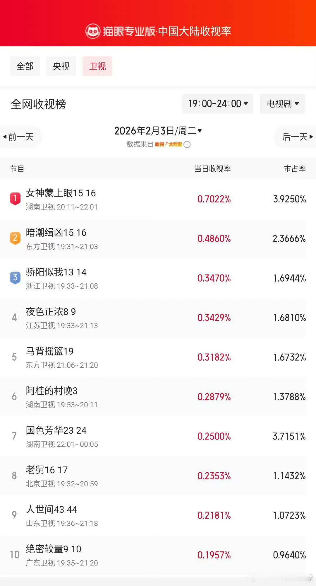 卫视收视率第一,猫眼、欢网均破0.7,酷云突破0.6网络剧播放第一,单日播放突破3000万