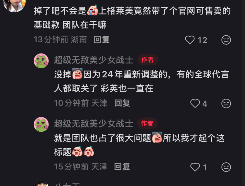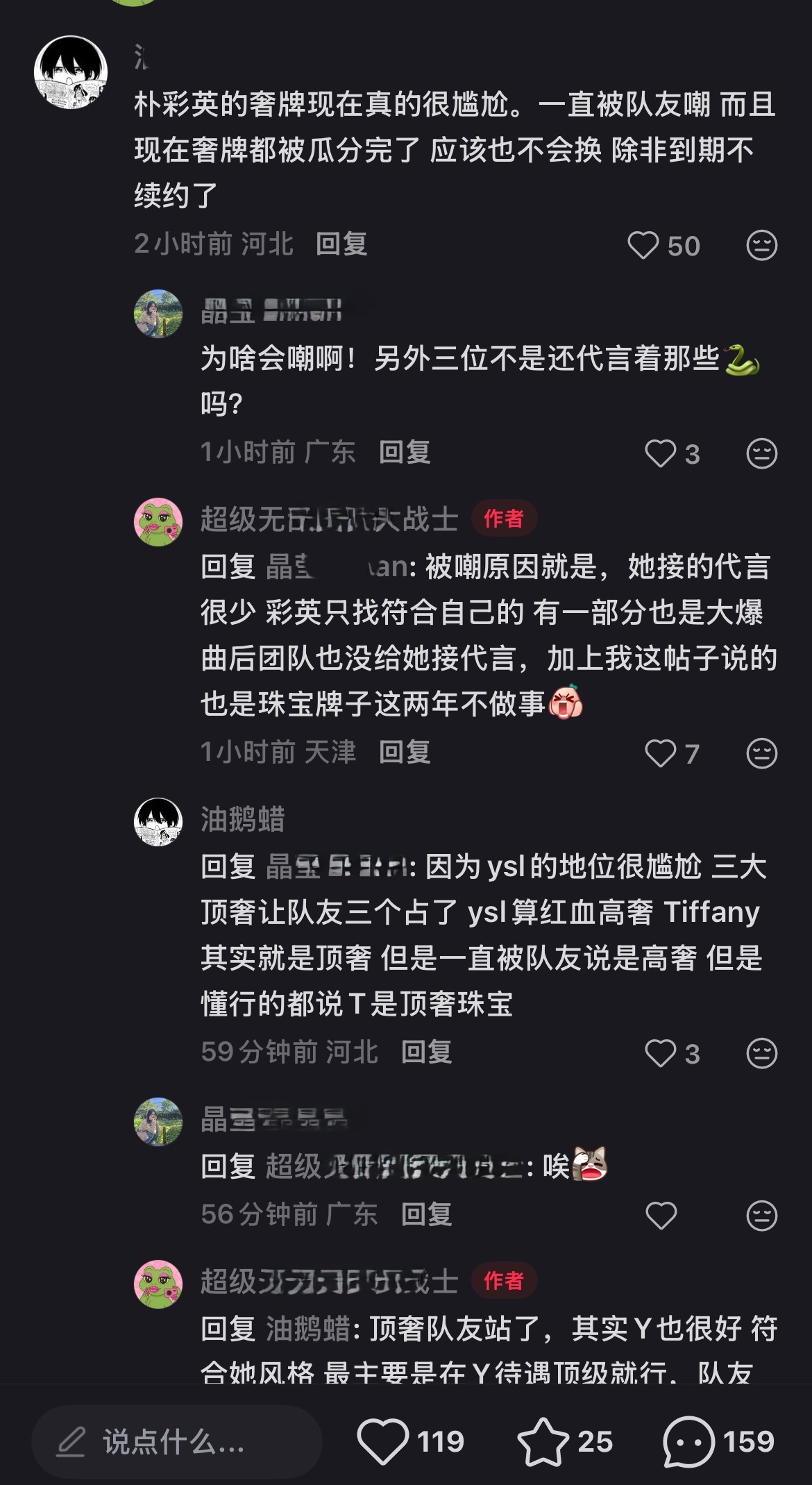 《Tiffany怎么还没到期呢,一直拖后腿》《奢牌被队友瓜分完了,除非到期,R没法接这些牌子》《R只找符合自己的》,说的好像老马户有的选似的《懂行的都说tiffany是顶奢珠宝》《Y到现在没有代言人,只有R是最高待遇,这牌子就是不官宣,(宋佳)那个仅限国内,和全球不是一码事儿》,有时候不知道老马户粉是不上网呢,还是看不懂品牌的官宣,宋佳人家是正儿八经的中国代言人,怎么,中国就不算国家,不能算代言人了?只有全球才算,那老马户得有啊,她有吗?