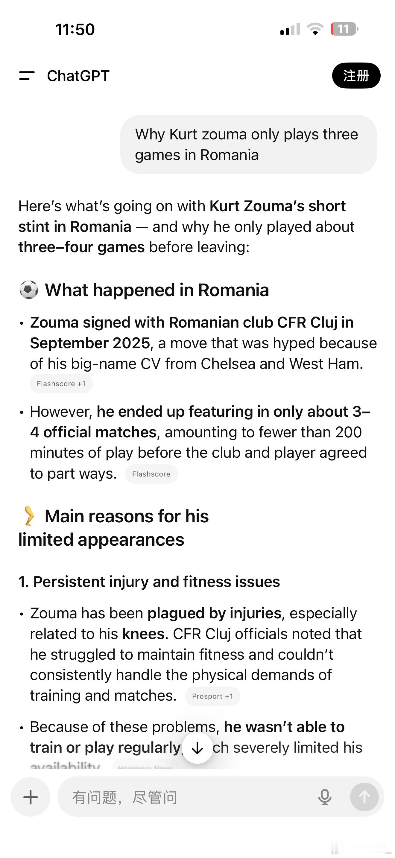 祖马在克鲁日半年时间一共上场107分钟,首发一次。合同提前终止。罗马尼亚联赛水平不高,克鲁日今非昔比,已经不再是联赛豪门。至于为什么打不上比赛,问了AI,搜集了资料,罗马尼亚媒体说的很清楚,长期不断的伤病(特别是膝盖),让他无法适应高强度训练,进而身体无法达到比赛要求。膝盖的伤如果反反复复,那确实很难痊愈,即便千佛山医院也不是啥病都能治,先不说比赛状态了,连训练都是个问题,掂量着吧!