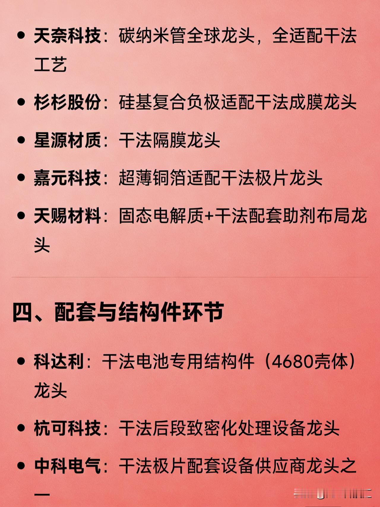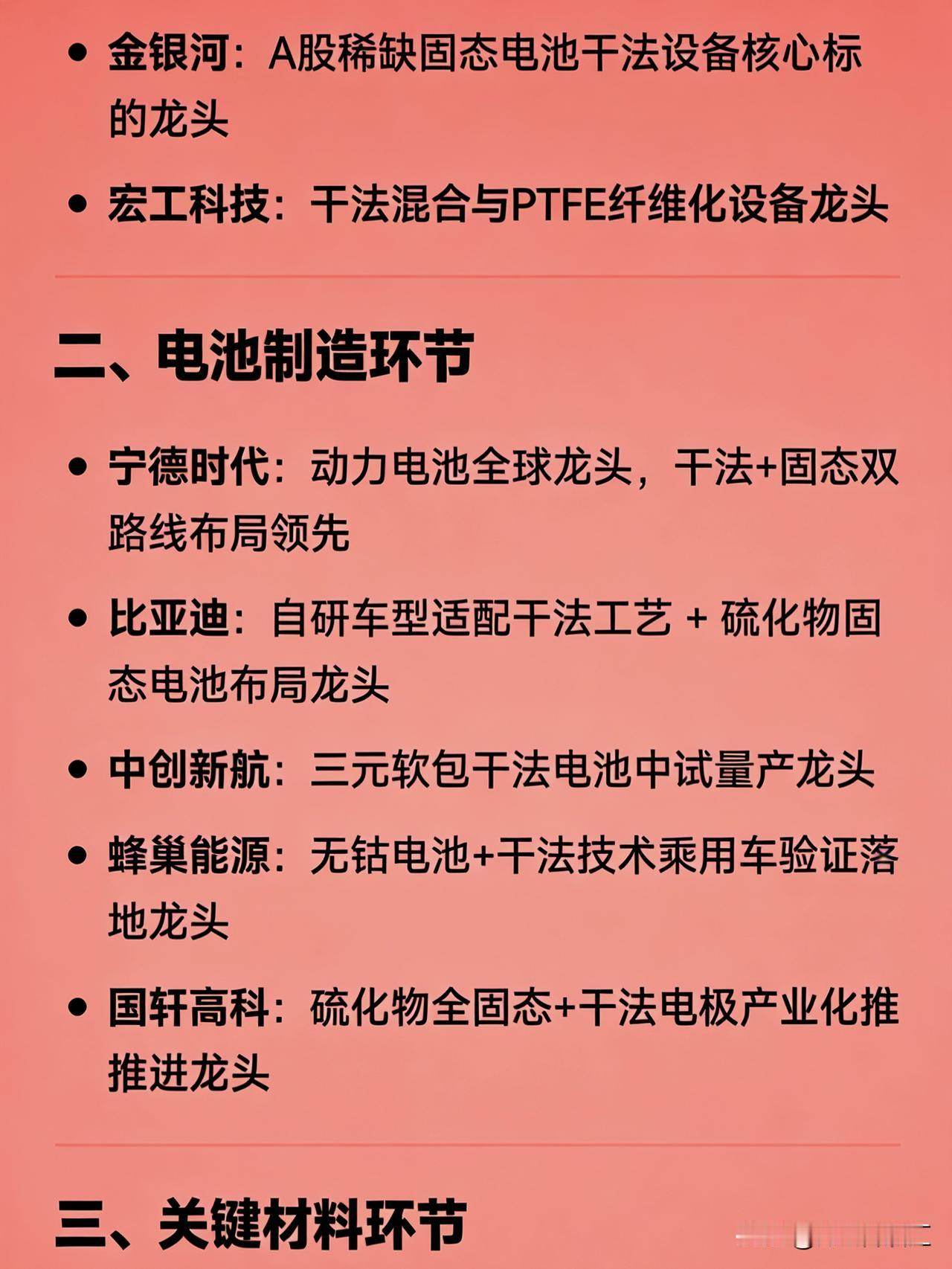 马斯克干法电极电池概念龙头 一、核心设备环节 先导智能:全球干法电极整线设备 + 全固态电池整线解决方案龙头 纳科诺尔:干法辊压成膜设备龙头 利元亨:干法电极整线及高通量多辊压延设备龙头 曼恩斯特:干法涂布设备龙头 信宇人:干法搅拌涂布一体机龙头 洪田股份:干法电极设备概念龙头 金银河:A股稀缺固态电池干法设备核心标的龙头 宏工科技:干法混合与PTFE纤维化设备龙头 二、电池制造环节 宁德时代:动力电池全球龙头,干法+固态双路线布局领先 比亚迪:自研车型适配干法工艺 + 硫化物固态电池布局龙头 中创新航:三元软包干法电池中试量产龙头 蜂巢能源:无钴电池+干法技术乘用车验证落地龙头 国轩高科:硫化物全固态+干法电极产业化推进龙头 三、关键材料环节 璞泰来:干法专用粘结剂 + 负极材料一体化龙头 天奈科技:碳纳米管全球龙头,全适配干法工艺 杉杉股份:硅基复合负极适配干法成膜龙头 星源材质:干法隔膜龙头 嘉元科技:超薄铜箔适配干法极片龙头 天赐材料:固态电解质+干法配套助剂布局龙头 四、配套与结构件环节 科达利:干法电池专用结构件(4680壳体)龙头 杭可科技:干法后段致密化处理设备龙头 中科电气:干法极片配套设备供应商龙头之一