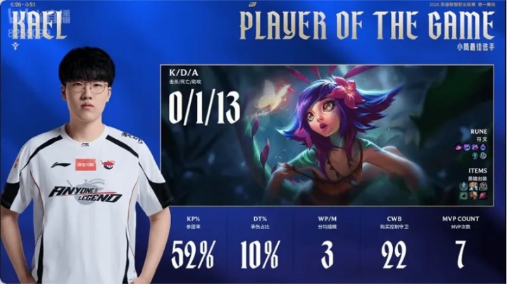 Kael妮蔻打出0/1/13战绩,拿到AL对阵WBG次局比赛MVP