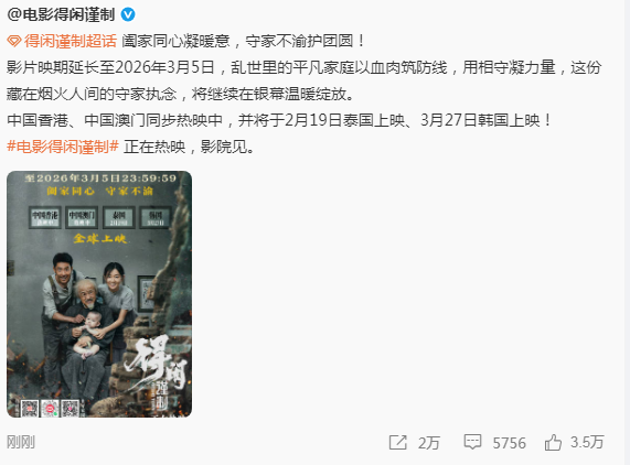 普天同庆!由肖战主演的《得闲谨制》密钥延长到3月5号,不是春节档,却跨越春节档,真是喜大普奔,这个春节可以携家人朋友再次重看这部优秀的抗日影片,也能让许多平时没有时间的人,可以在春节期间去看了。 而且中国香港和澳门也同步上映,2月19日泰国上映,3月27日韩国上映。这真是好电影热映不断,走出国门,争光添彩。这部抗日战争中的小人物故事是那段岁月很多国家和人民抗争的剪影,势必引发莫大的共鸣。这部影片或许并不恢弘,但真实感人,节奏明快,抓人眼球,让人笑中带着泪,燃起振奋昂扬的精神,是一部有深度,有感染力,有教育意义的不可多得的好片,值得更多的人看到。