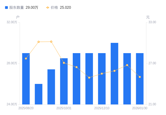 日期A股户数(户)流通A股户均持股数(股)户均持股市值(万元)2026-01-302900009862.3424.682026-01-202900009862.3426.382026-01-093000009533.6024.702025-12-102900009862.3425.152025-11-282900009862.3424.582025-11-102900009862.3426.092025-10-3128500010035.3727.182025-09-3027417410431.6231.482025-09-1926000011000.3133.172025-08-202900009862.3427.33