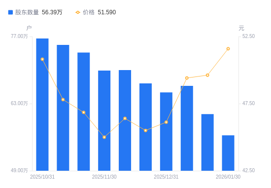 日期A股户数(户)流通A股户均持股数(股)户均持股市值(万元)2026-01-305639376410.4133.072026-01-206081195944.6729.502026-01-106671575418.6126.772025-12-316533245533.3425.522025-12-196721705378.2024.472025-12-106999115165.0423.972025-11-306989005172.5123.282025-11-207364504908.7723.002025-11-107525004804.0722.962025-10-317658004720.6423.99