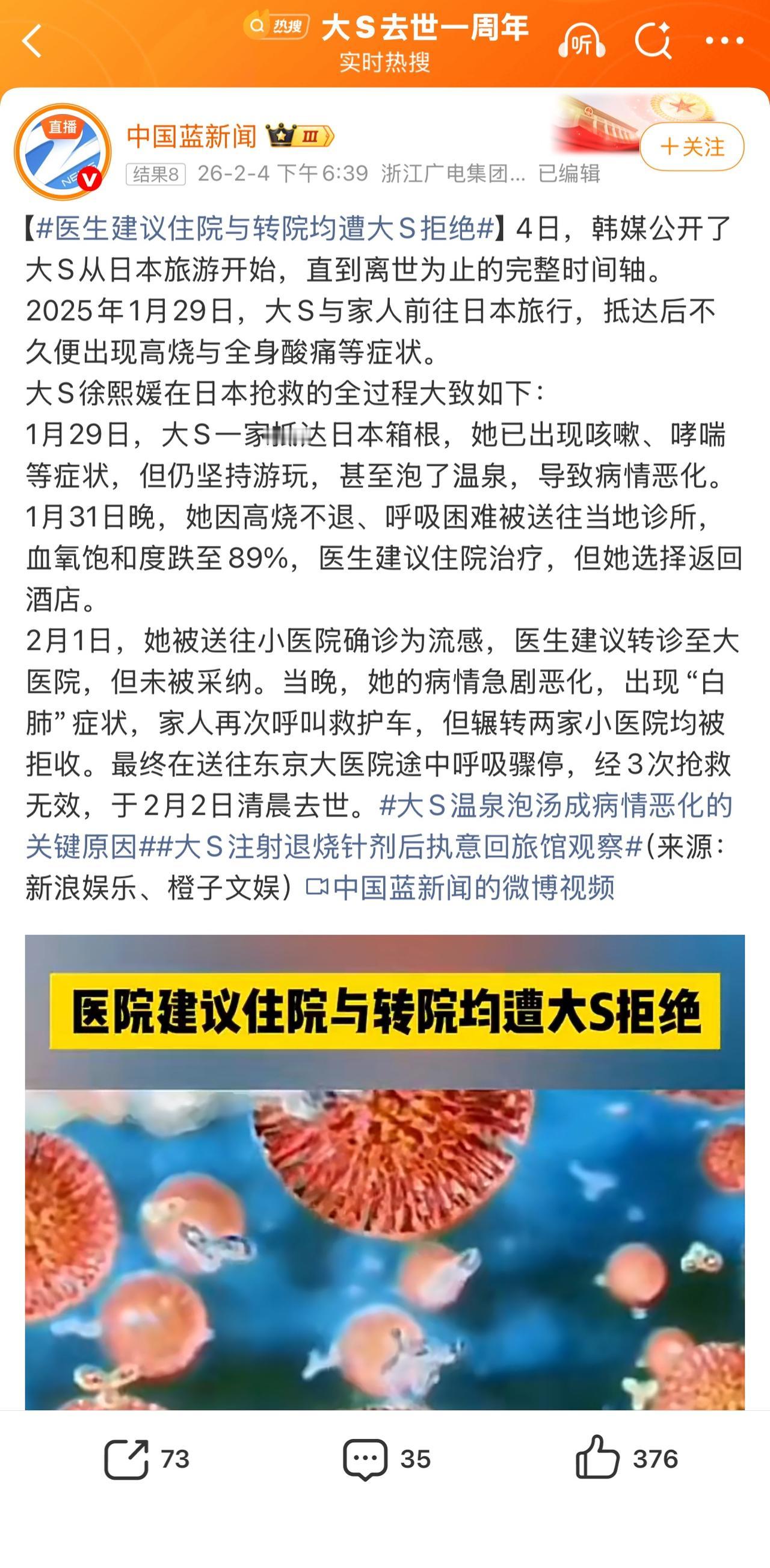 果然大S的死不简单,并不单纯是因为流感引发的肺炎并发症。 今天才知道,原来大S当时是有抢救生还的机会的,可她都错过了。 大S刚到日本就发烧了,人不舒服,但是她却觉得泡下温泉就能降温。 可是,人在发烧的时候,毛孔都是打开的,这个时候洗澡和泡温泉都是不可取的,但是她却没有这个意识。 后来,她又因为高烧不退送去当地小诊所,血氧饱和度都降到了89%了,医生建议她住院治疗,她又没有当回事,坚决返回酒店。 2月1日她被诊所确定为是流感,医生建议她去大医院治疗,可是又被她拒绝了。 她硬生生的错过了三次抢救的机会啊,更让人觉得可气的是,当时她身边没有一个亲人出来阻止她这种荒唐的决定。 但凡他们当中有一个人出来阻止,她可能就不会死。 她的死,源于自己对疾病的不够重视,以及她家人的漠视,太可惜了。