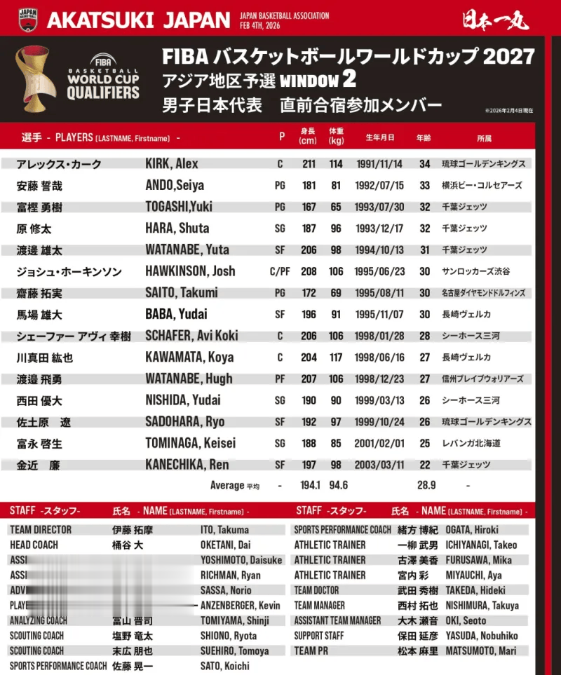 虎扑02月04日讯今日,日本篮协公布世预赛第二窗口期球员集训名单。