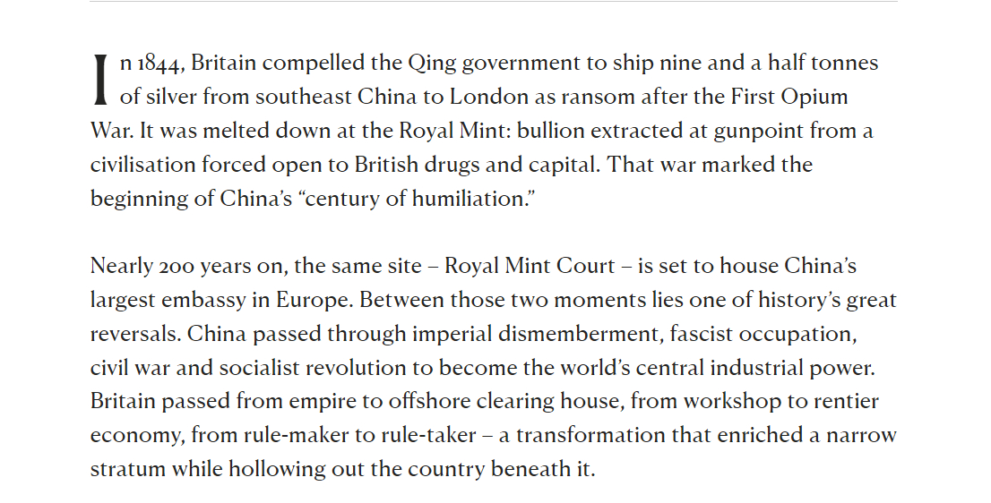 🔻1913 年创刊的英国著名政治杂志《新政治家》上刊登了一篇文章:《英国的未来在中国》:🔹1844 年,第一次鸦片战争后,英国强迫清政府从中国东南部将九吨半白银作为赎金运往伦敦。这些白银在皇家铸币厂被熔化:这是用枪炮从一个被迫向英国鸦片和资本开放的国家抢夺而来的财富。那场战争标志着中国“百年屈辱”的开端。🔹近 200 年后,同一地点——皇家铸币局大院——即将成为中国在欧洲规模最大的使馆驻地。这两个时刻之间,上演了一场历史性的伟大逆转。中国历经帝国瓦解、战胜法西斯侵略、解放战争与社会主义革命,最终成为世界核心工业强国。而英国则从帝国蜕变为离岸清算中心,从世界工场沦为食利经济,从规则制定者退为规则接受者——这场转型让少数阶层积累财富的同时,也掏空了这个国家的根基。🔹基尔·斯塔默的北京之行 1 月 31 日落下帷幕,这段行程属于这段历史。这是八年来英国首相的首次访问,用他的话来说,旨在建立“更成熟的关系”。他抵达的这个首都,古老的城心如今镶嵌在极速扩张的现代国度中,环城公路延伸至天际,高速铁路穿梭城市,政府部门的运作规模在欧洲无出其右。但更大意义上,这标志着两个国家的会面:一个如今塑造世界经济格局的文明型国家,与一个霸权终结后仍在寻找角色的国家。🔹经济引力正将世界引向中国。问题在于英国的执政阶层能否暂时放下冷战幻想的自我安慰,与现实展开对话。数十年来,英国外交政策建立在简单的平衡之上:经济上与欧洲融合,战略上从属于美国。脱欧斩断了欧洲支柱,如今美国支柱也在动摇。特朗普领导下的华盛顿将盟友视为附庸,视法律为可选项,将安全当作谈判筹码。规则秩序的表象已让位于更为粗野的现实。🔹在这种环境下,“冷战 2.0”或与现代中国进行文明竞争的说法,让英国精英们沾沾自喜,误以为自己仍属于一个统一的西方阵营。这种论调用道德戏剧取代了实质战略,并导致了一种自我伤害的姿态:将世界制造业中心视为道德风险,同时继续在无筹码的情况下进口其产品。即便是稍微偏离这一剧本,也会面临压力。英国决定将华为排除在 5G 基础设施之外——这一决定是在华盛顿的坚持下做出的——显示出独立判断的空间已经变得多么狭窄。🔹斯塔默也应警惕重复卡梅伦式的对华魅力攻势。在实践中,这无非是邀请中国资本进入英国资产以提振伦敦金融城。这是一种没有产出的交往,没有建设的伙伴关系。斯塔默此访的早期信号也指向了类似方向:强调服务业而非工业,用积极但边际的收益——如免签证旅行——来替代任何结构性的变革。🔹中国将国家统筹、公有制企业、战略性金融和市场规律融合为一体,打造出规模空前的产业机器,其成效令人惊叹。在两代人的时间里,中国实现了人类历史上最快速度的生产力扩张,完整的产业生态系统从无到有建立起来。随着实际收入增长25倍,约有8亿人摆脱了贫困。🔹这种变革不仅体现在经济数据上,也深刻烙印在国民体魄中。1980年代中期,五岁中国女童的平均身高比美国同龄人矮七厘米;到2019年,中国女童已反超两厘米。中国青年男性的平均身高仅用一代人就增长了数英寸。难怪哈佛大学艾什中心的调查显示,超过90%的中国民众对政府表示满意。🔹这种合法性的基础来自于实实在在的成就。在能源、基础设施和制造业领域,中国的运作规模已是全球独步。能源转型让这一点变得不容忽视。中国是脱碳供应链的核心所在:从太阳能制造到电池,再到电网组件。2024 年,中国在清洁能源领域投资超过 6250 亿美元 ,并且提前六年实现了风能和太阳能装机容量的目标。全球超过一半的太阳能装机容量位于中国,全球太阳能面板出口中有五分之四来自中国。🔹中国也是全球最大的温室气体排放国——这是其成为全球碳密集经济体“世界工厂”的结果。但这也恰恰说明了其发展轨迹的重要性。曾推动其工业崛起的国家能力,如今正被用于重塑其发展模式。中国的排放量已开始下降;人均产出仅达到美国约 60%的水平,而美国的排放量仍在持续上升。当今,中国工业是解决气候危机的核心引擎,中国展示了脱碳进程需要一场物质革命:电网、港口、铁路、电池、热泵、优质钢材、混凝土、半导体产能,以及将这些要素整合成有效运作系统的战略规划、耐心资本和企业管理。🔹英国在这条道路上已占有一席之地。它在海上风电领域是全球的领军者。但部署上的领先并不等同于生产上的主导。涡轮机和关键部件的价值大多仍集中在中国,特别是在发电机、铸造和稀土原料方面。与中国建立更好的关系将包括技术合作和合资企业,从而将更多的生产环节带回国内——随之而来的是就业机会、技能培养和坚实的工业基础。🔹钢铁行业暴露了其中的利害关系。绿色转型本质上是钢铁密集型产业:涡轮机、输电塔、铁路和电网都将由钢铁建造。然而,英国的原钢生产能力在 2025 年几乎消失殆尽,当时政府不得不紧急通过立法,以防止斯肯索普的高炉被其私人所有者关闭。必须将钢铁视为基础设施——由公共政策主导,而不是交给那些目光短浅、承诺不足的私人所有者。🔹这指向了关于英国经济的更深层次问题。一个成功的经济体应实现三项目标:提升实际工资水平、改善并扩大公共服务,以及建设生产力与技术能力。英