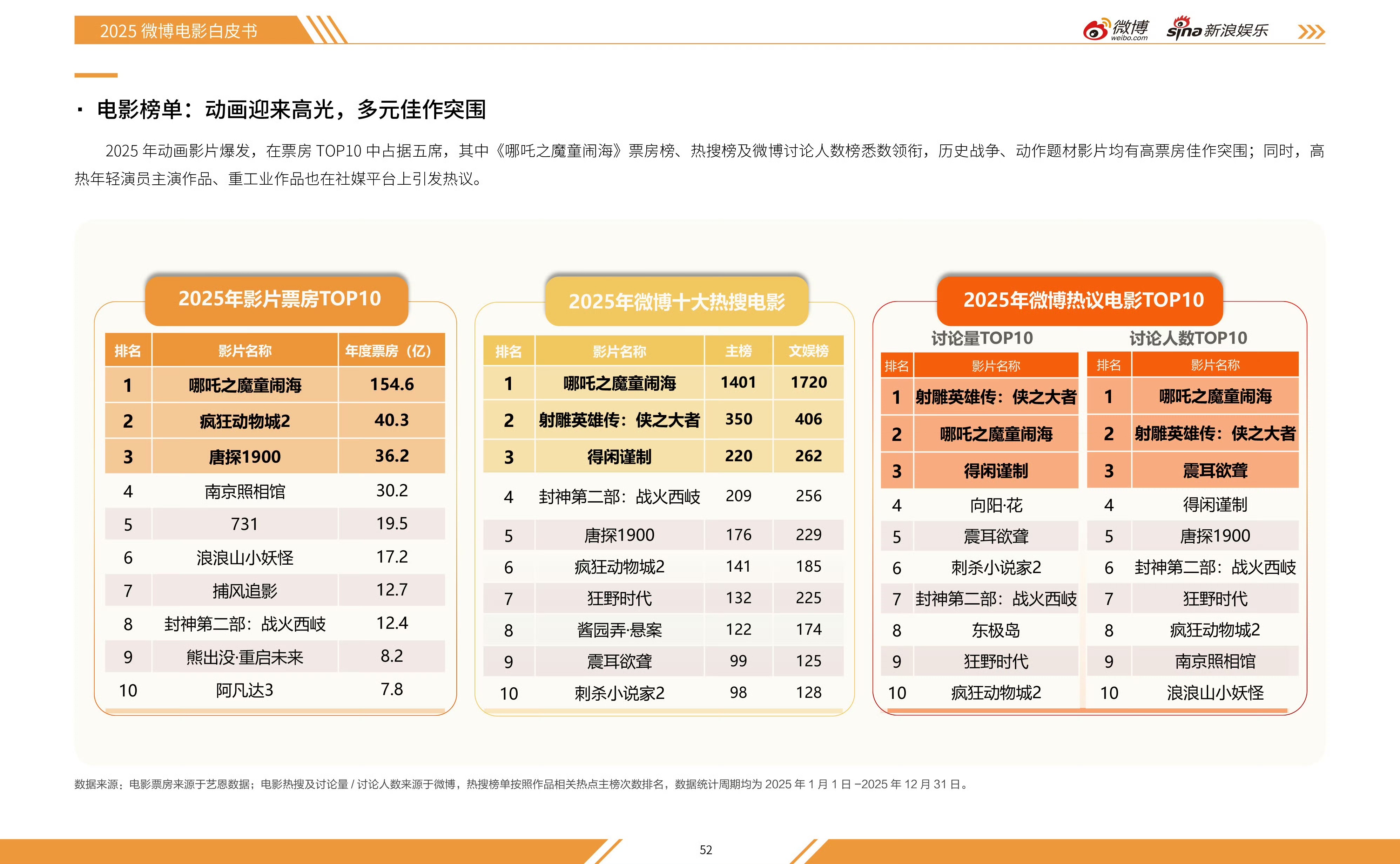 2025微博娱乐白皮书十大热搜电影:《哪吒之魔童闹海》《射雕英雄传:侠之大者》《得闲谨制》《封神第二部:战火西岐》《唐探1900》《疯狂动物城2》《狂野时代》《酱园弄·悬案》《震耳欲聋》《刺杀小说家2》。你有二刷的电影么?