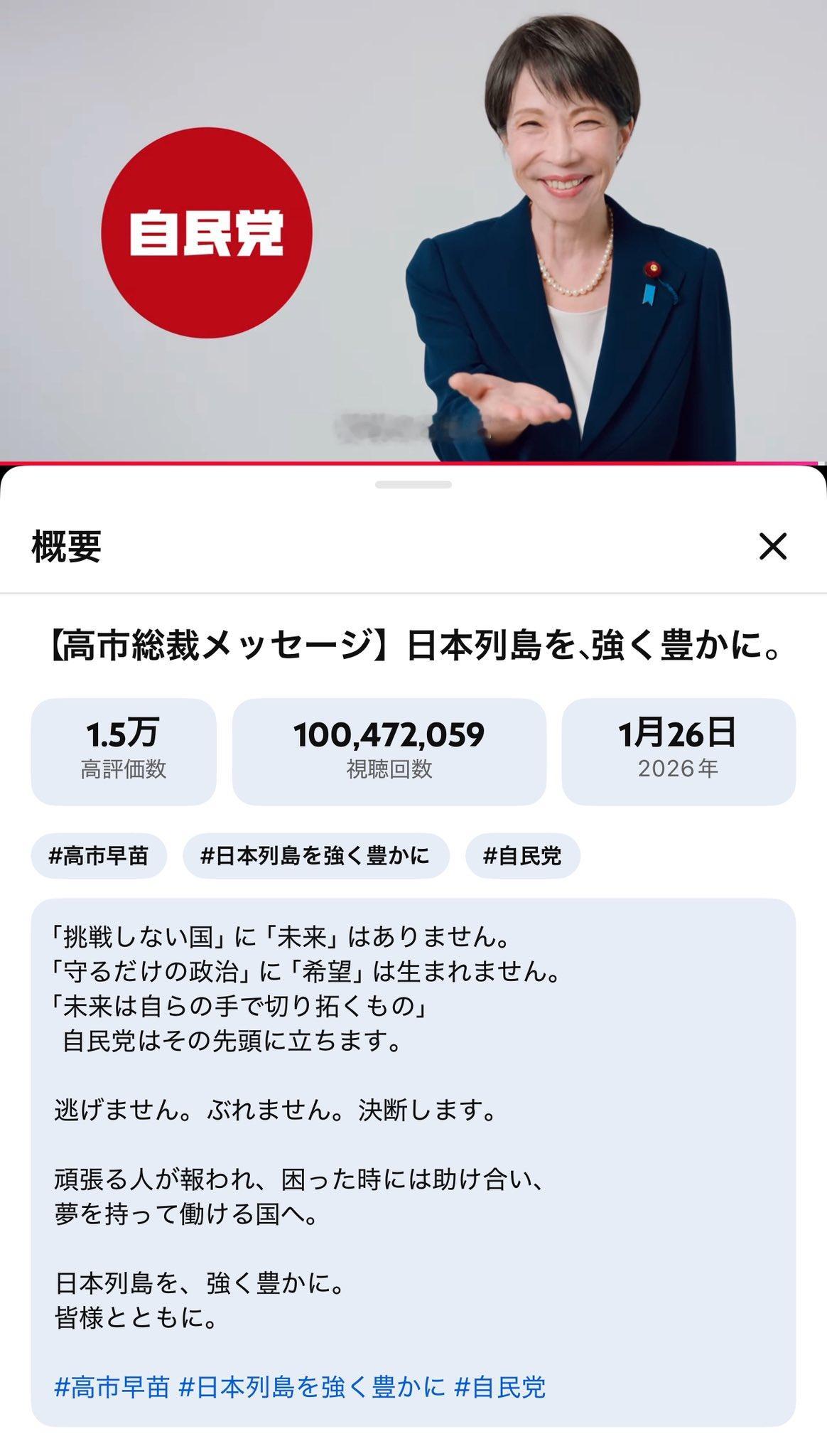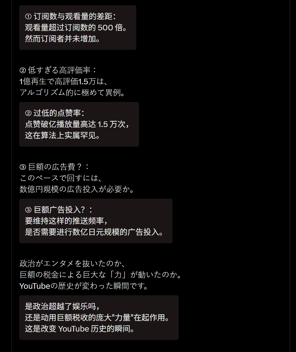 🔻网友分享:高市早苗的宣传视频刷数据翻车了。🔻用力过猛,仅用8天就达到了一亿播放量。🔻所以,这是日本油管历史上最快达到一亿播放量的视频(据称是全球第 13 快),第2名是YOASOBI 的《アイドル》,花了35天,第3名是米津玄师的 《KICK BACK》,花了3个月。🔻但是,视频的评论只有1.5万个,远低于这个播放量的正常评论数(50-200万个)🔻选举开始前,高市早苗和自民党的普通宣传视频,平均播放量只有几千次左右。🔻现在日本人在问:“花了国民多少钱?”海外新鲜事热点现场