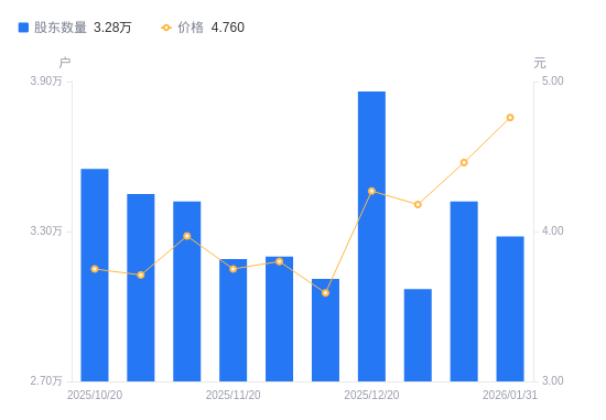 日期A股户数(户)流通A股户均持股数(股)户均持股市值(万元)2026-01-313280037575.3017.892026-01-203420036037.1316.072026-01-103070040145.6016.782025-12-203860031929.2713.632025-12-103110039629.2614.232025-11-303200038514.6914.642025-11-203190038635.4214.492025-11-103420036037.1314.312025-10-313450035723.7713.252025-10-203550034717.4613.02