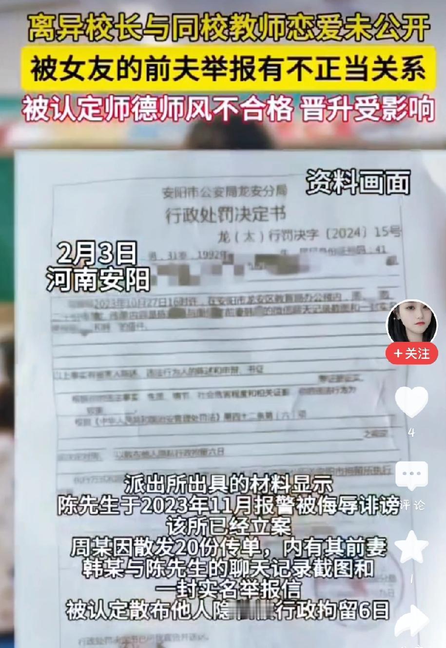 离异校长与离异女教师谈恋爱竟被认定师德不合格而接受处分!正常恋爱何错之有? 谁能想到,俩个离异的人正常谈恋爱就被认定为有违公序良俗,校长被免职,老师被辞退,为此岗位晋升都受到了影响,难道自由恋爱也有错了? 河南安阳龙安区西高平小学原校长陈某与同校离异女教师韩某的一场正常恋爱,竟引发了一连串的职业处罚,成为全网热议的焦点。陈某被认定师德师风不合格、调离原校,韩某被辞退。为此陈某的岗位晋升也受到了牵连! 据悉,陈某2011年离婚,韩某2022年离婚,二人于2023年6月确立恋爱关系,因顾虑工作影响未对外公开。同年8月,韩某前夫周某通过窃取手机隐私获取二人聊天记录,在教育局办公楼散发含聊天截图和举报信的传单,指控二人存在不正当关系,相关内容传播后引发负面网络舆情。陈某报警后,周某因散布他人隐私被行政拘留6日。 但事件并未就此结束,区纪委经调查后,认定陈某行为违反社会公德和党的生活纪律,给予其党内警告处分并免去校长职务,陈某随后被调离原校,代课教师韩某也被学校辞退。2025年底,陈某在参与岗位晋升竞聘时才发现,自己2024年的师德师风考核被定为不合格,教育部门表示,该认定依据纪委处分决定,符合《河南省中小学幼儿园师德师风评价考核办法》中“违背社会公序良俗可直接认定师德不合格”的规定。 陈某对此结果表示不认可,认为自己与韩某是离异后的正常恋爱,为此他多方反映,问题都没有解决。 实在想不明白,离异的两个人谈个恋爱有什么不妥?难道就是因为一个是校长一个是他的下属吗?恋爱本是自由,我认为,他们既没有出轨也没有保持不正当关系。而仅仅因为韩某前夫的恶意举报和散发隐私传单引发舆情,就对他们进行如此严厉的处罚,实在是有失公允。师德考核很有必要,但是正常的私人生活也不应被过度干涉。 如今,社会倡导的是自由、平等的恋爱观,只要在道德和法律的框架内,人们有权去寻找自己的幸福。对于校长与教师的身份,他们在工作中确实需要遵守职业规范,但这并不意味着他们的私人感情生活就要被特殊审视。对此你怎么看?