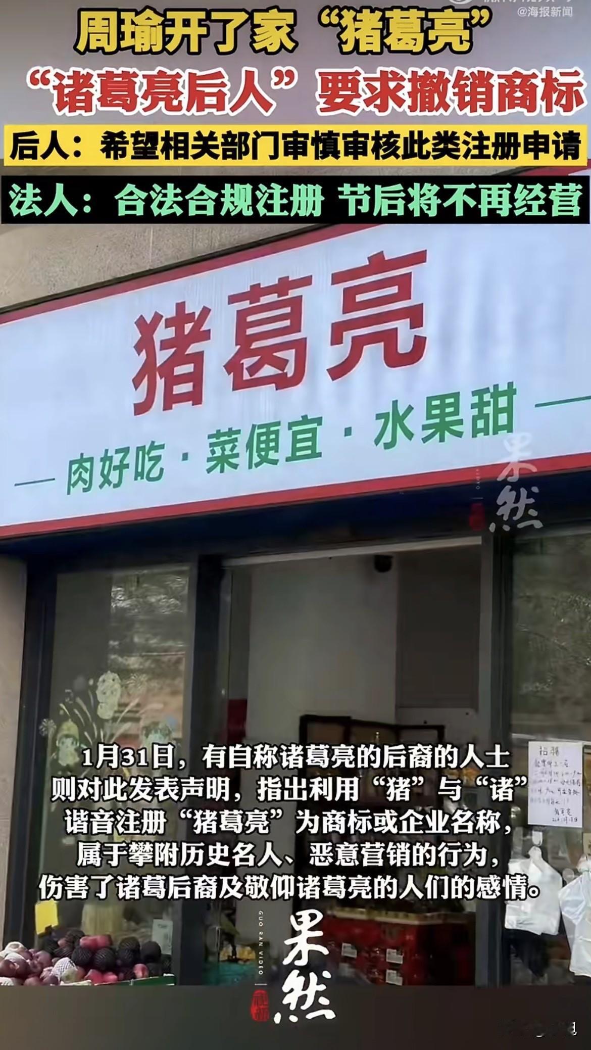 好家伙,周瑜开的公司不叫“江东水产”,叫“猪葛亮食品”?这剧情,罗贯中来了都得愣一下。 就是广东东莞这家公司,法定代表人名字一栏,明明白白写着“周瑜”。公司名字呢,玩了个谐音梗,叫“猪葛亮食品有限公司”。这俩名字放一起,网友直接炸锅,都说这是“现实版《三国演义》”,还有人开玩笑问“诸葛亮知道了会不会气活”。 那边,诸葛亮的后人真坐不住了。有人以诸葛亮后裔的身份发了声明,说用“猪”字来谐音,属于攀附老祖宗诸葛亮的名气搞恶意营销,伤害了家族和所有敬仰诸葛亮的人的感情。更关键的是,他们说目前已经发现了近200家注册了“猪葛亮”相关商标或企业。他们觉得这已经不是个别玩笑了,担心会误导公众,甚至对传统文化传承产生不良影响。 公司这边的回应也挺有意思。法定代表人周女士说,公司名字是自己想的,在合法合规前提下注册,不是刻意恶搞或蹭热度。但话锋一转,她马上又说,公司春节后就不经营了,会按规定办注销。这听起来,像是一场热闹还没开始,就要匆匆散场。 热闹背后,其实藏着个挺难的法律问题。律师说了,诸葛亮是历史人物,他的名誉权本身已经不受法律保护了。现在的诸葛亮后人,从法律上讲,算不上是能直接提起诉讼的“近亲属”。所以,他们很难直接去告这家公司侵犯了谁的名誉。 那后人还能怎么办?律师指了条路:关键得看这个“猪葛亮”的注册和使用,是不是构成了法律上说的“不良影响”。也就是说,不能只说我们家人感情受伤了,得证明这种用法对社会风气、对诸葛亮这个公共文化符号本身造成了贬损。比如,注册人是不是明知诸葛亮是谁,还故意用“猪”字来谐音,就是为了博眼球、搭便车。这个认定,弹性就很大了。 这事儿有意思就有意思在这。你说它违法吧,手续可能是全的。你说它没问题吧,大家看着心里又确实有点硌应。它踩在了商业创意和公众情感、历史尊重之间那条模糊的线上。当“周瑜”和“猪葛亮”在营业执照上并列的时候,它消费的已经不止是两个名字,而是我们很多人心里对那段历史和那个人物的共同认知。 现在公司说要注销,可能这场风波表面会过去。但它抛出的问题没过去:这种历史名人谐音梗,到底是小聪明的“创意”,还是对文化的不够尊重?如果下次来个“孙悟空”注册“孙吾空”,或者“林黛玉”注册“淋带玉”,我们又该怎么看? 对于这种公司名,你觉得是可以接受的搞笑创意,还是应该管管的冒犯呢?