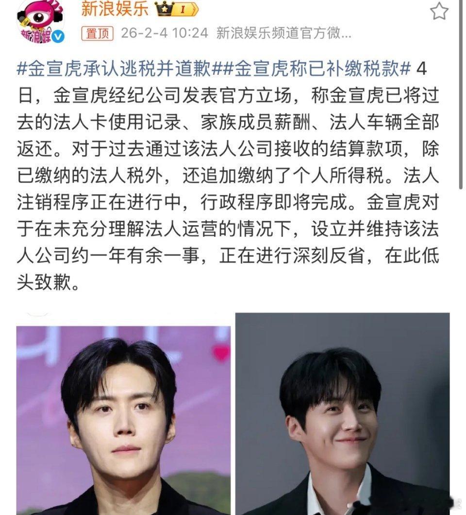 2月4日,金宣虎所属经纪公司发布官方声明,确认其存在逃.税行为并正式致歉。据悉,金宣虎已完成相关税.款补缴,返还法人卡使用记录、家族薪酬及法人车辆,涉事法人公司的注销程序也在推进中。他坦言因自身对法人运营认知不足引发问题,对此深刻反省。