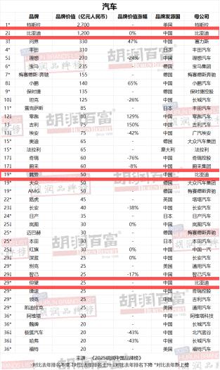 2025胡润汽车品牌榜来了,23个国产品牌上榜,比亚迪再次登顶 近日,规则调整后的2025胡润汽车品牌榜正式公布,此前,收录入榜的均为国产品牌,而2025年,该榜单首次收录非国产品牌,不过需要注意的是榜单仅统计面向中国消费者的品牌价值,海外收入不计。 2025胡润汽车品牌榜全榜共收录了40个汽车品牌,其国产品牌23个、非国产品牌17个。前十名中有五个国产品牌和五个非国产品牌,国产品牌分别为比亚迪、问界、理想、小鹏、坦克;非国产品牌分别为特斯拉、丰田、宝马、奔驰、保时捷。 值得一提的是国产品牌中的比亚迪排名尤为亮眼,该品牌以1200亿元的品牌价值获得国产汽车品牌第一名,加上此次,比亚迪四度登顶。此外,比亚迪旗下的子品牌腾势和仰望品牌也分别以50亿元和25亿元的品牌价值首次登榜。 想必不少朋友对这个榜单并不会太在意,但作为一个汽车从业者,我个人觉得,我们大部分消费者在买车前,是完全可以先参考这个榜单,选择榜单靠前品牌旗下的车型入手,出错的概率会大大降低。