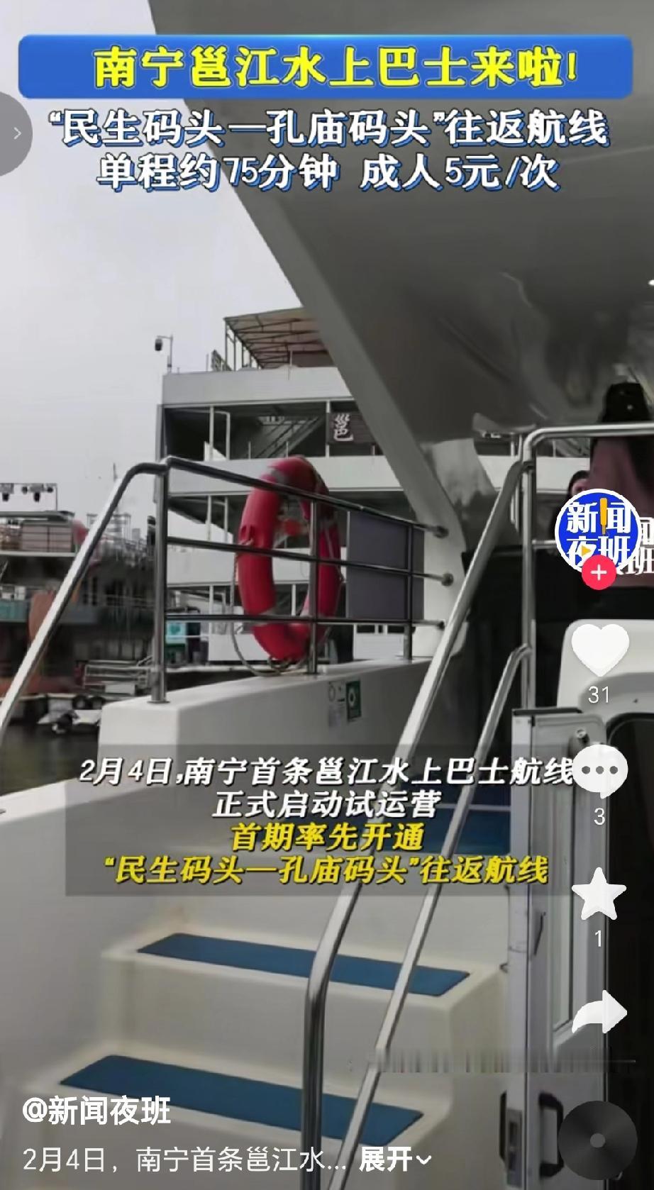 2月4日南宁首条邕江水上巴士航线正式启动试运营首期开通“民生码头—孔庙码头”往返航线,此前相关部门还对蒲庙、亭子等码头的设施和安全设备开展过核查,后续或许会拓展相关航线。每日安排2班双向对开。民生码头发船时间为08:30、14:30;孔庙码头发船时间为10:30、16:30,单程航行时间约75分钟。票价标准:实行惠民票价,成人单程5元/人次,儿童、老年人等特殊群体有相应优惠,具体优惠细则以码头现场公示为准。(来源于@新闻夜班)