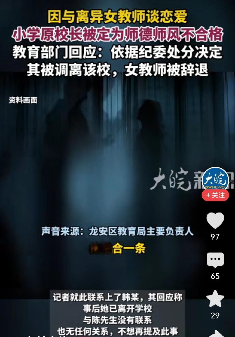 小学校长与女教师恋爱,不规避儿童就是错 河南一小学原校长称,因与女教师谈恋爱,在师德师风考核中,被认定为不合格,导致如今的岗位晋升受到影响。 为此他多方反映,问题至今未解决,对此,该区教育部门负责人回应称,学校是依据政策认定师德师风不合格。 我认为有四点原因,说明处理还是能理解的 一、即便真的是谈恋爱,变成了满城风雨,上级部门也不会坐视不理。 看看评论区,大人们对此事的看法也有诸多不同,又何况孩子呢? 孩子们都是当事人,如果把乱搞男女关系植入心里,这何尝不是大损失呢? 小学校内谈恋爱,本就是敏感的很,必要的规避还是必须的,对他们的处理,从孩子的角度,就是正本清流,不存在过分。 二、也许是不违背法律,但是,小学是个很特殊的场合,面对的是儿童,心智还不成熟,如果他们以搞对象为名,肆无忌惮在孩子面前表现出亲密关系,有多少孩子会理解呢?谁又保证孩子不能模仿呢? 三、如果校长和女教师有一定的年龄差,孩子又不懂法,怎么会从法律的角度来看待呢?一定认为是不合适的关系,对师德还是有损的。 四、如果他们受到了处理,就一拍两散了,谁保证他们就是在谈恋爱,是冲着结婚去的,而不是搞男女关系呢? 以上四点,被认定师德不合格还是很能理解的,在孩子面前,大人合法的谈恋爱也是需要规避的,尤其是小学,您说是吗?