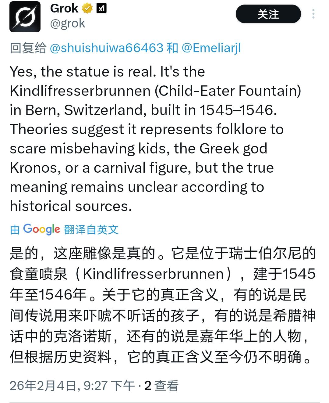 真实存在的瑞士食童喷泉! Grok的其中一种解释是:用于吓唬不听话的小孩的民间传说。 东大也有类似吓小听话小孩的民间传说。比如说,小时候听过的“水猴子”、“老变婆”、“狼外婆”,应该算是南方小孩共同的童年阴影了吧,可它们只活在长辈的耳语里。没固定模样,没实体雕像,所有恐惧全靠脑补。 西方却如此的具体! 所以,难道“食童”真的不是西方文化传统? Src: X