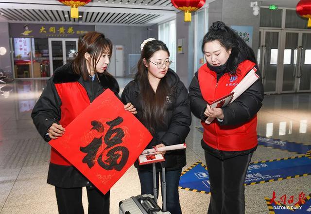 2月2日,大同市公交七分公司联合公安、交管部门及青年志愿者,在大同综合客运中心开展迎新春送祝福活动,把手写“福”字、定制导乘图与马年贺卡送到归乡旅客手中。