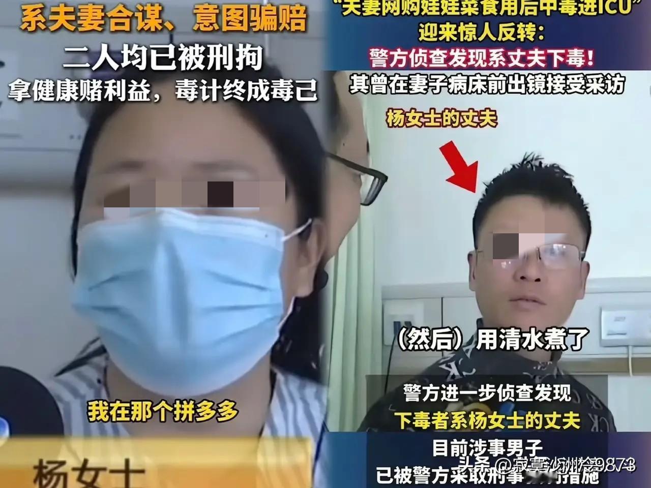 这夫妻俩可真是心狠之人,为了骗取保险金和赔偿金,居然给自己下毒! 网购娃娃菜中毒事件再度反转!最初听闻网上买菜后中毒一事,便觉事有蹊跷。商家售卖渠道并非仅这一处,别家都安然无恙,唯独他们出事,当时便猜测其中定有隐情。 随后有报道称,是丈夫在菜里注射了老鼠药,企图毒杀妻子。感觉这种说法有一定可能性,刚要信以为真! 结果,更惊人的消息传来。官方报道显示:夫妻俩合谋给自己下毒,目的就是从平台和商家那里获取高额赔偿金! 而最终,夫妻俩不仅一分钱没拿到,反而面临刑事拘留,并且女人体内还残留着老鼠药! 这夫妻俩有这股狠劲,还愁干啥不成,非要拿生命开玩笑走捷径,如若闹出人命,真可谓得不偿失!