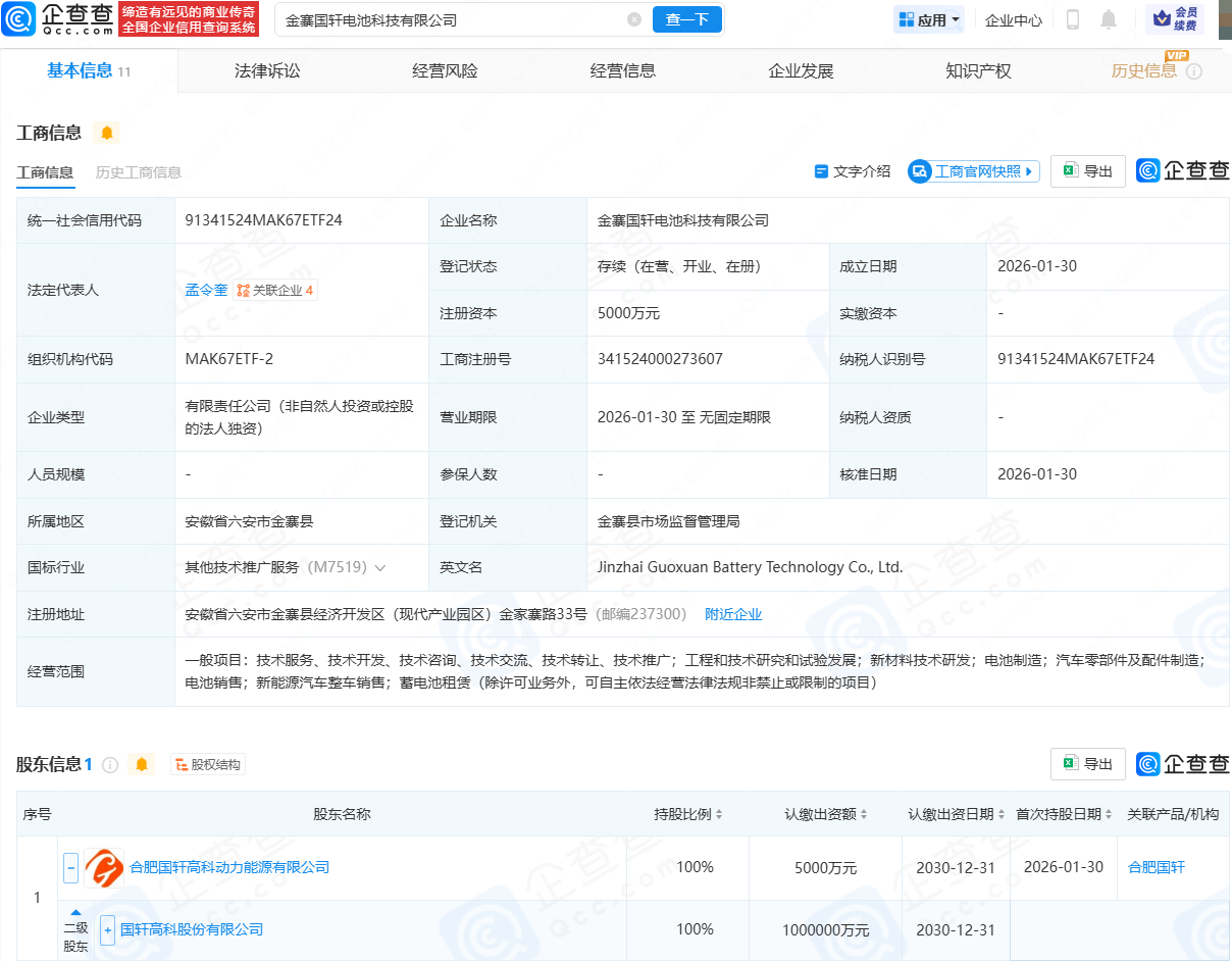 企查查APP显示,近日,金寨国轩电池科技有限公司成立,法定代表人为孟令奎,注册资本为5000万元,经营范围包含:新材料技术研发;电池制造;汽车零部件及配件制造;电池销售;新能源汽车整车销售;蓄电池租赁等。企查查股权穿透显示,该公司由国轩高科(002074)间接全资持股。