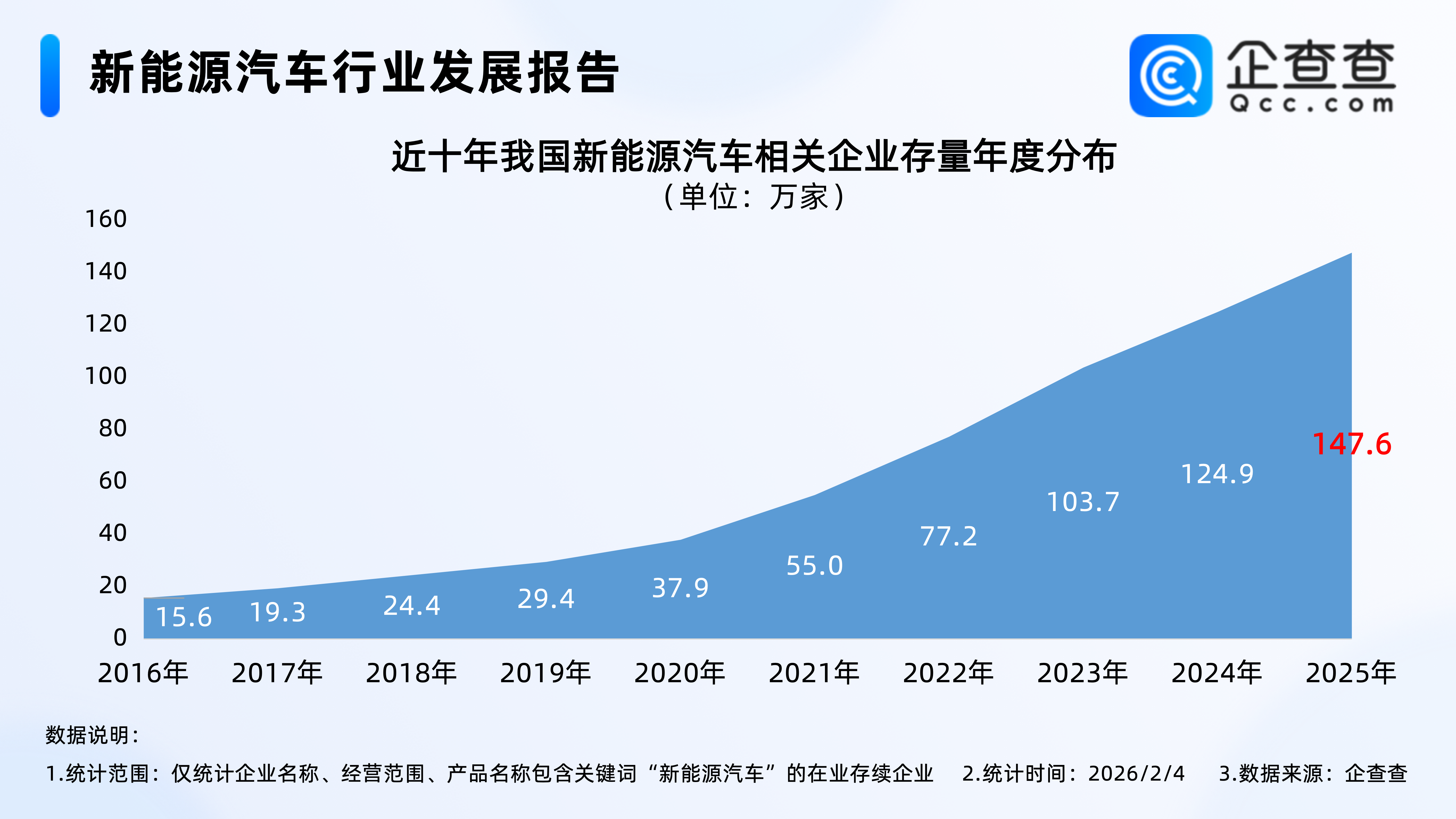 企查查数据显示,近十年,我国新能源汽车相关企业存量逐年增加,2023年相关企业存量正式突破100万家,达103.7万家;2025年年底,我国在业存续147.6万家新能源汽车相关企业。截至2026年2月4日,我国现存149.3万家新能源汽车相关企业。