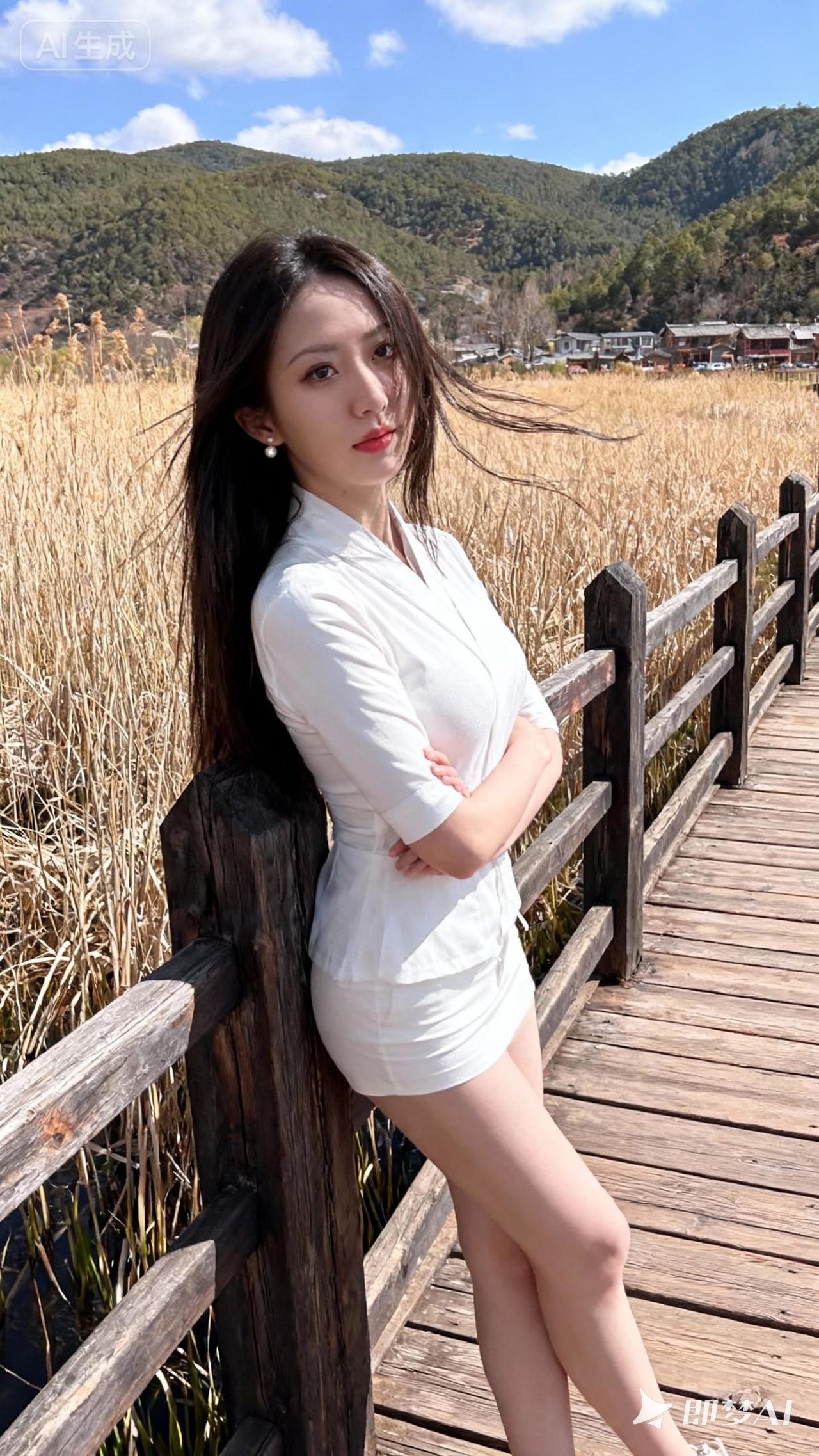 在秋日田野中,她倚靠木桥,微风拂面,宛如一幅诗意画卷。