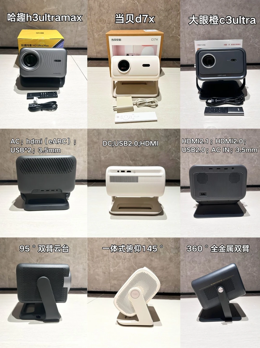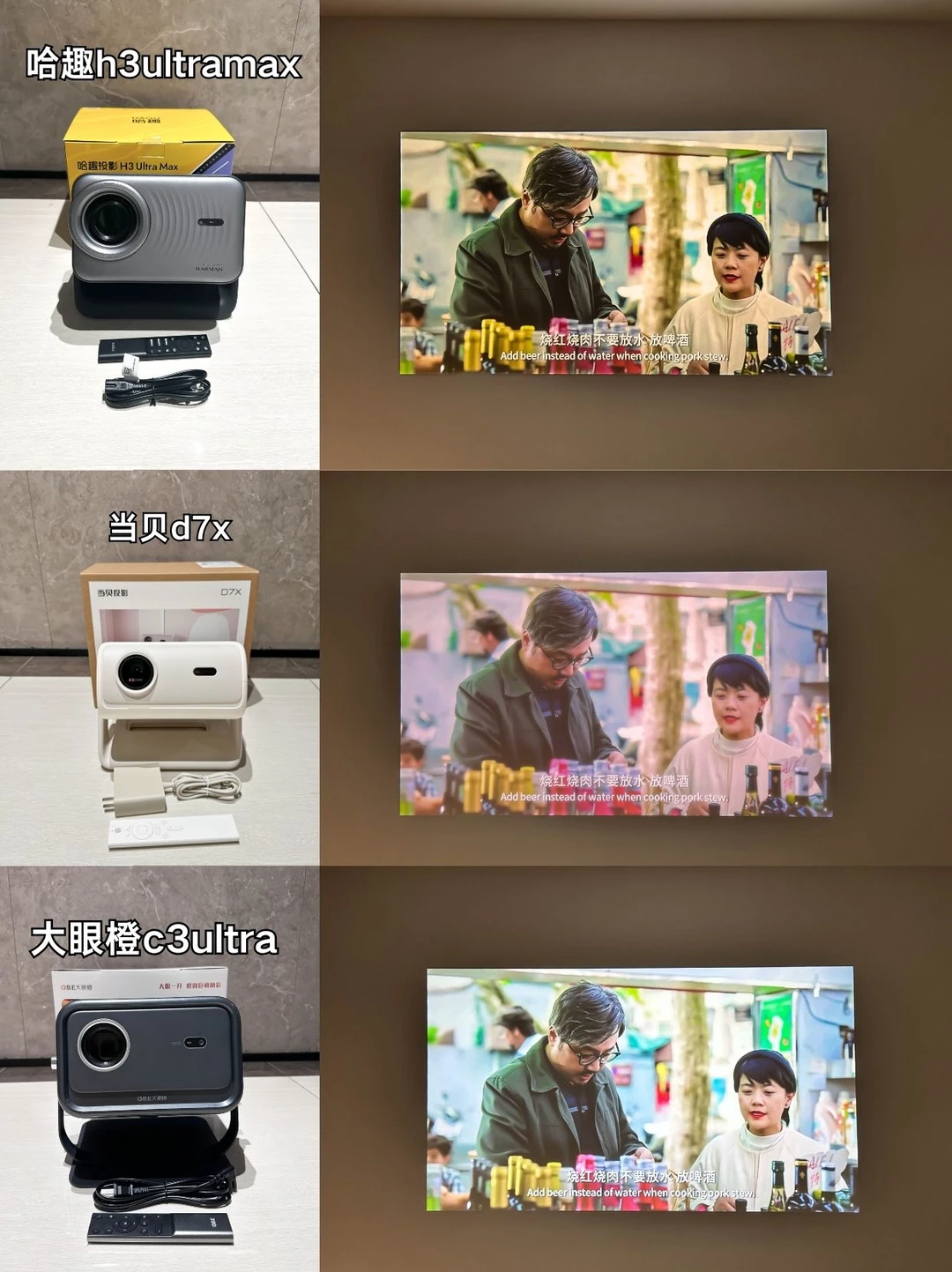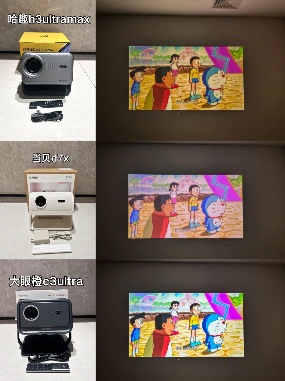 这次直接测评三款投影仪——哈趣h3ultramax、当贝d7x、大眼橙c3ultra,这三款投影仪的差异如何请见图 核心定位: ✅ 哈趣h3ultramax:千元影音款,音质不错,双6w扬声器加持 ✅ 当贝d7x:米家智能互联,轻奢之选 ✅ 大眼橙c3ultra:120Hz高刷屏+MT9669 旗舰芯,观影游戏无短板,静音智能双拉满,具备高亮、卧室、标准三种观影模式