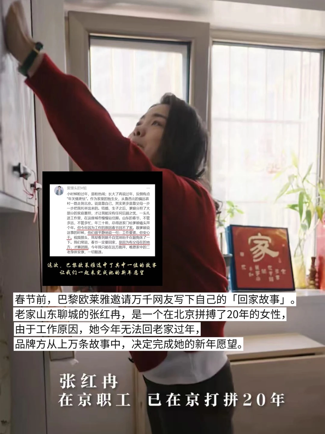 巴黎欧莱雅联手快手推出的这条春节主题品牌短片,将镜头对准了一个在北京拼搏了20年的女性——张红冉,它通过普通人“反向团圆”的故事,给我们提供了另一种情绪出口。