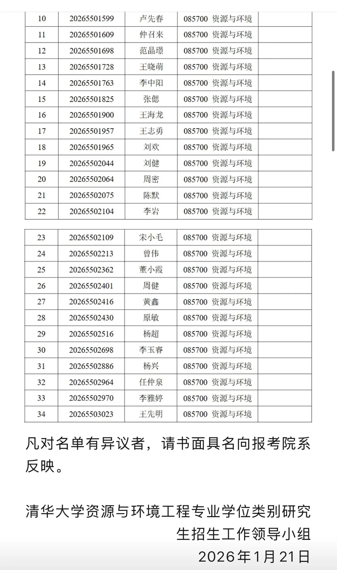 清华大学2026年创新领军工程博士项目-资源与环境招收公开招考博士研究生综合考核名单公示