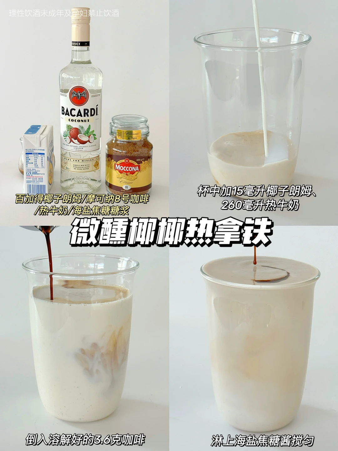 ✅微醺椰椰热拿铁(百加得椰子风味朗姆酒15ml➕摩可纳8号咖啡3.6g➕热牛奶260ml➕海盐焦糖糖浆5g )