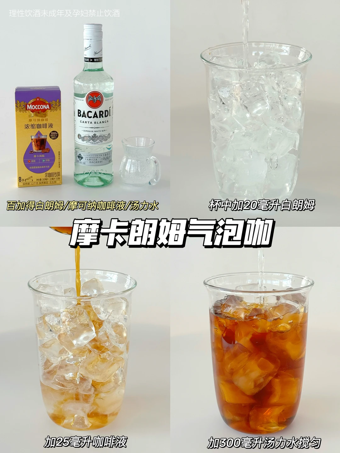 ✅摩卡朗姆气泡咖(百加得白朗姆酒20ml➕摩可纳摩卡浓缩咖啡液25ml➕冰块➕汤力水300ml)