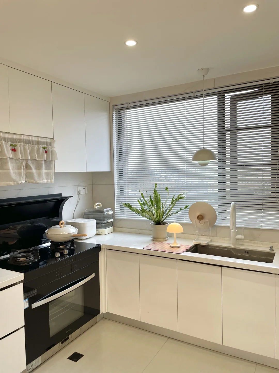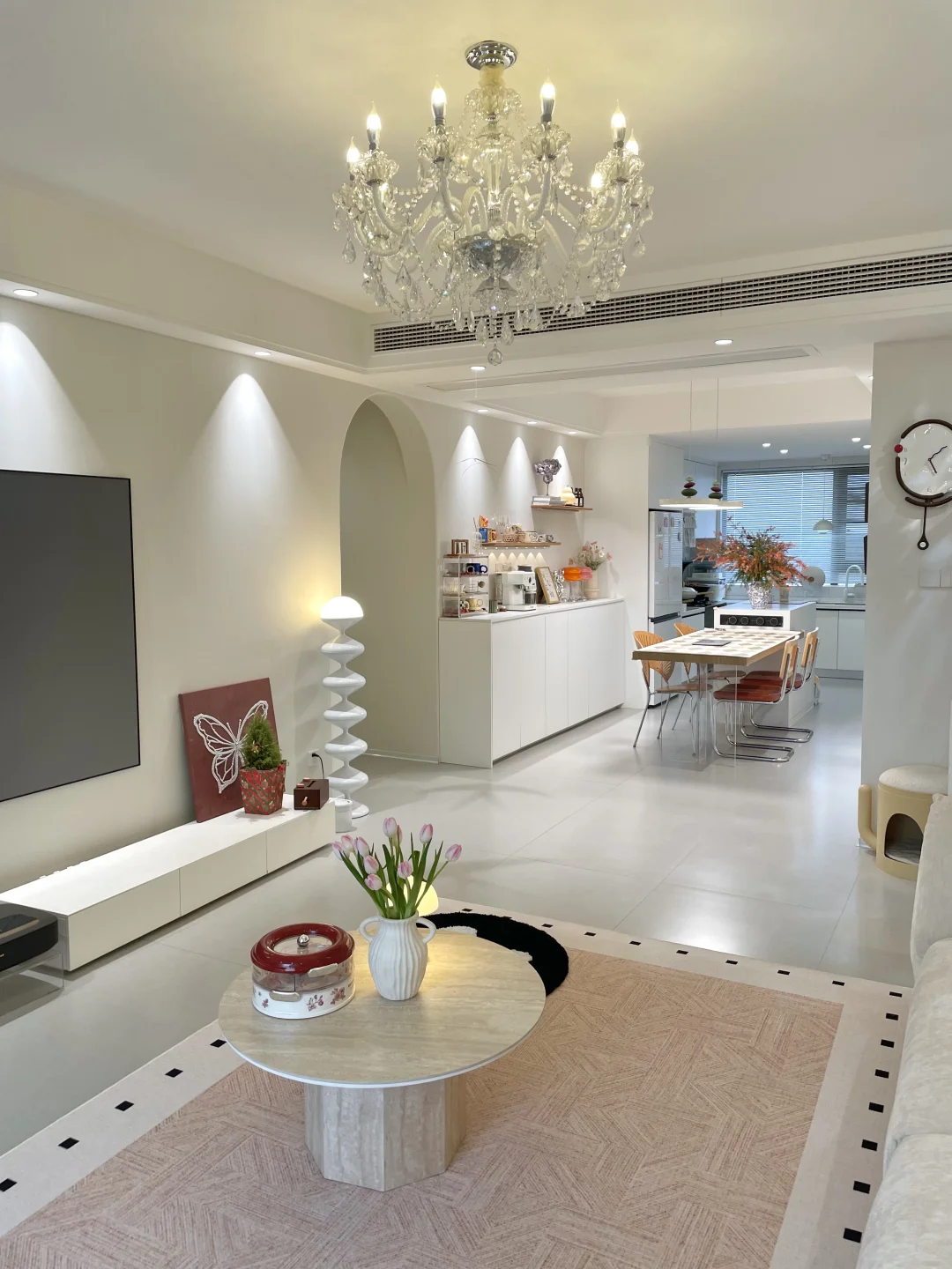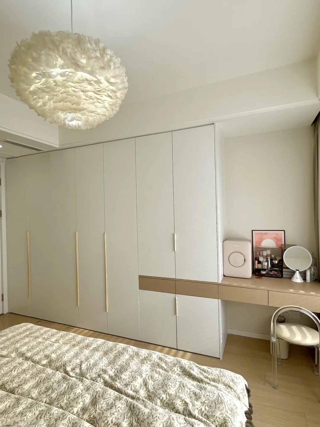 建面128 套内104 从设计到硬装到软装都是靠自己 亲力亲为花了不少心思 简单设计的小家,真的温馨又舒适 分享一些装修总结的干货: 一、轻硬装 我家南北通透户型,打通客厅阳台空间变大更宽阔,做了开放式厨房,全屋通铺750×1500柔光砖通刷浅色系乳胶漆,通透又明亮 二、重软装 灯光是软装必不可少的一部分,再加上搭配一些奶油色系的家具,干净又很清爽 三、满墙衣柜 主卧做了满墙的衣柜,空间,合理利用省了一个衣帽间出来,把所有衣服全部挂起来整洁干净