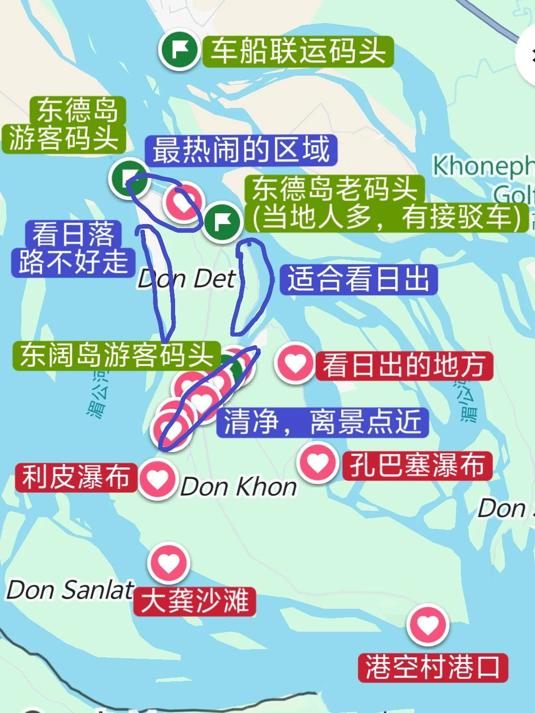 90%游客到双子岛:东德岛Don Det、东阔岛Don Khone,彼此通过大桥相连,景点基本在东阔岛: