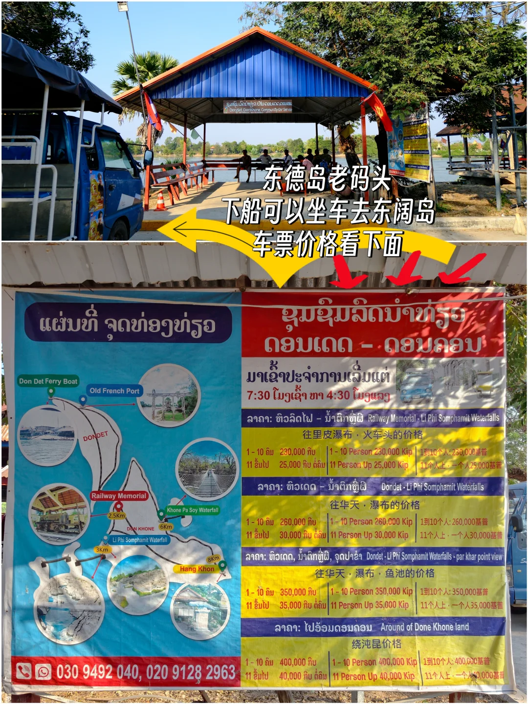🔶巴色南部客运站有双条车去码头,车程4-5h,车站离市区8km,车票120k,加上船票(东德岛Don Det20k、东阔岛Don Khone30k)后只便宜10k,极度不推荐。