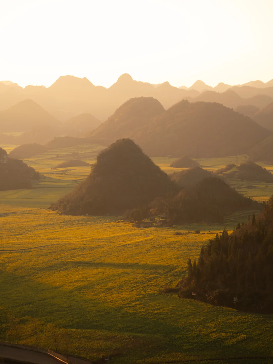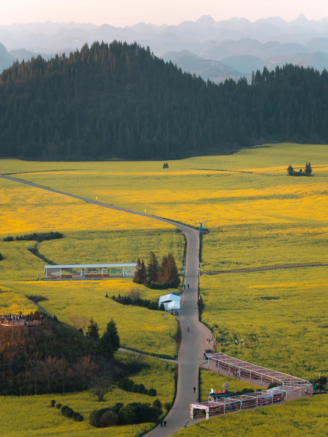 日出封神地!7点前冲老尖山观景台,晨雾裹着锥状峰林,阳光洒在花海上像碎钻闪烁✨ 体力差选电瓶车直达山顶,