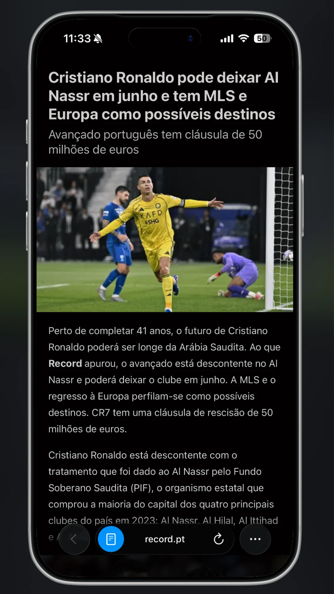 🔷 原文:“即将年满41岁的克里斯蒂亚诺·罗纳尔多,他的未来或许不在沙特阿拉伯。据“纪录报”报道,这位前锋在利雅得胜利队并不开心,可能在6月份离队。美国职业足球大联盟(MLS)和重返欧洲似乎都成了他的可能去处。C罗的解约金为5000万欧元。