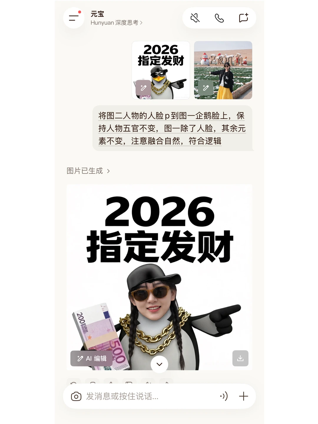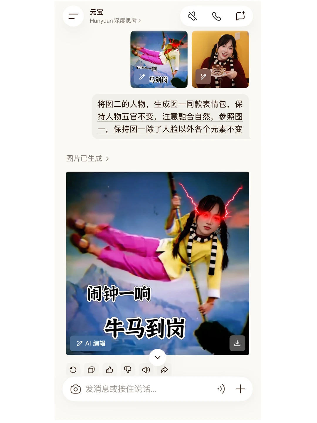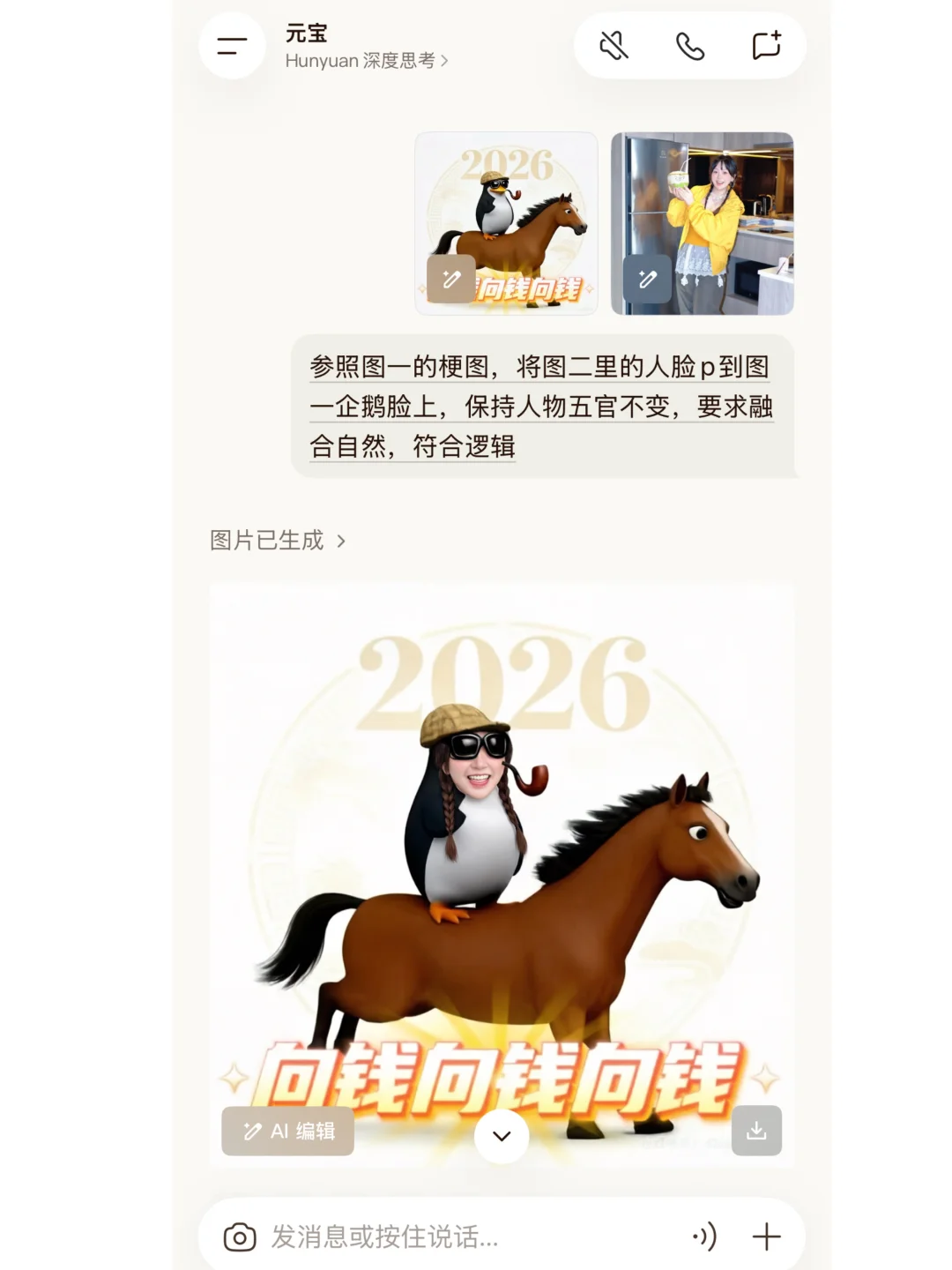 事情的起因是在领导办公室受了气 又不敢真和领导吵 生成一组抽象“牛马”表情包 小发雷霆一下! 没想到太好玩了,就这么玩了一下午 已经忘记到底为啥挨训 以及争吵的是什么工作了! 不仅生成牛马拍马屁连图,连新年美好祝愿也能顺便生成了 生成海报大片,或者整蛊好闺闺也是手到擒来 过年发朋友圈用! 元宝实在是太好玩了…
