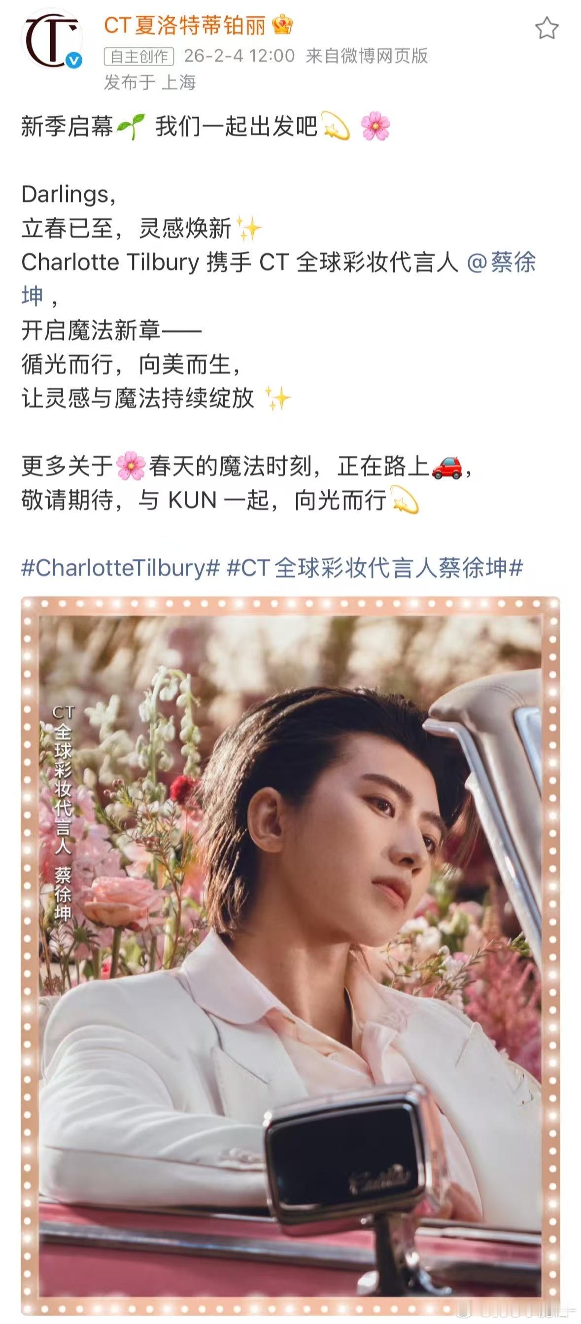第一个续约的代言人诶 恭喜蔡徐坤!!真的打破常规了吧 商业含金量🈶
