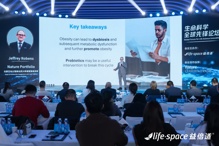 Nature社群互动主管兼自然大师课堂首席讲师JeffreyRobens在论坛上分享了微生态尤其是代谢和抗衰对人类健康的影响以及相关研究的发展,他介绍,已经有海量论文证实,肠道微生物与肥胖高度相关,多个独立科研团队通过小鼠及人体研究表明,补充益生菌有益于改善代谢、控制体重。他认为:“益生菌是微生态的基础,生命科学下一阶段研究应该聚焦细胞层面。”