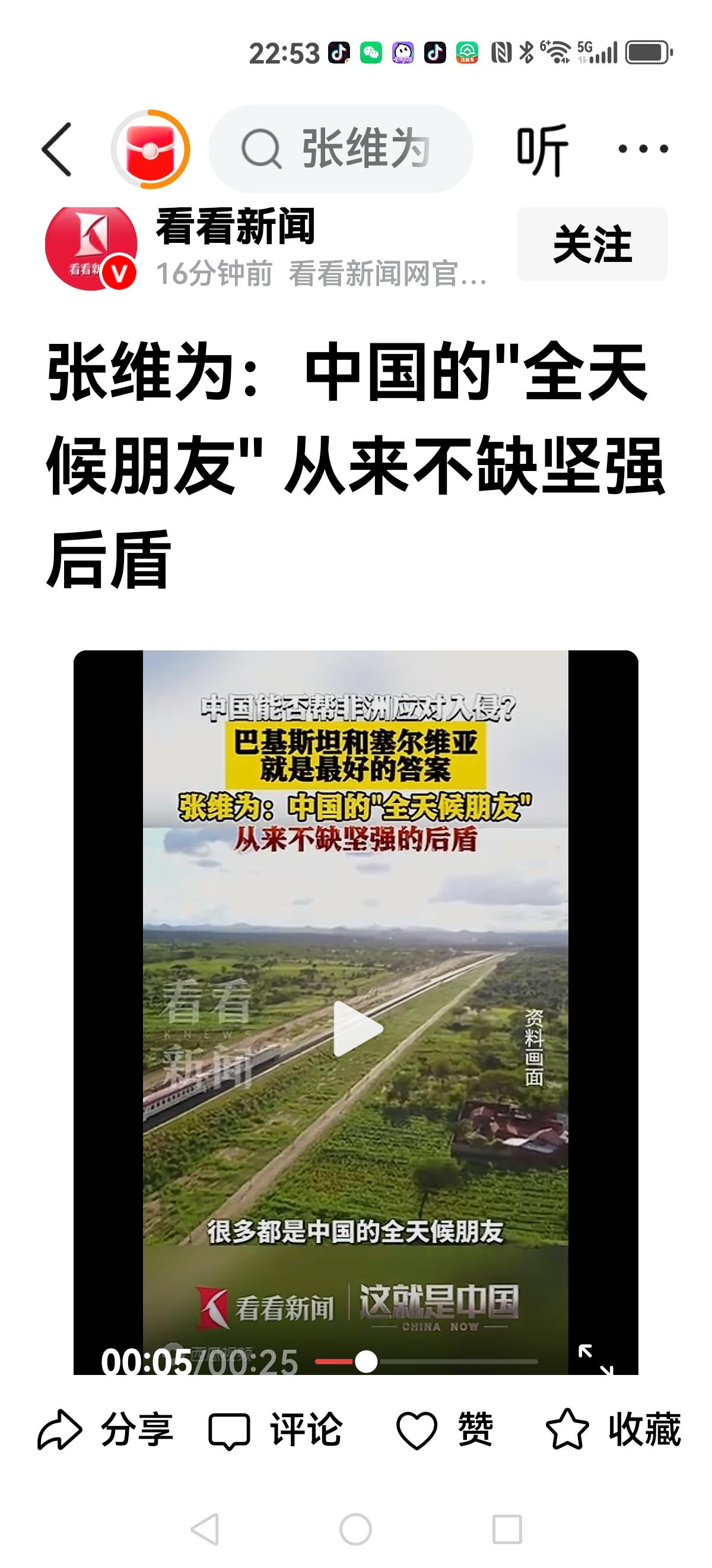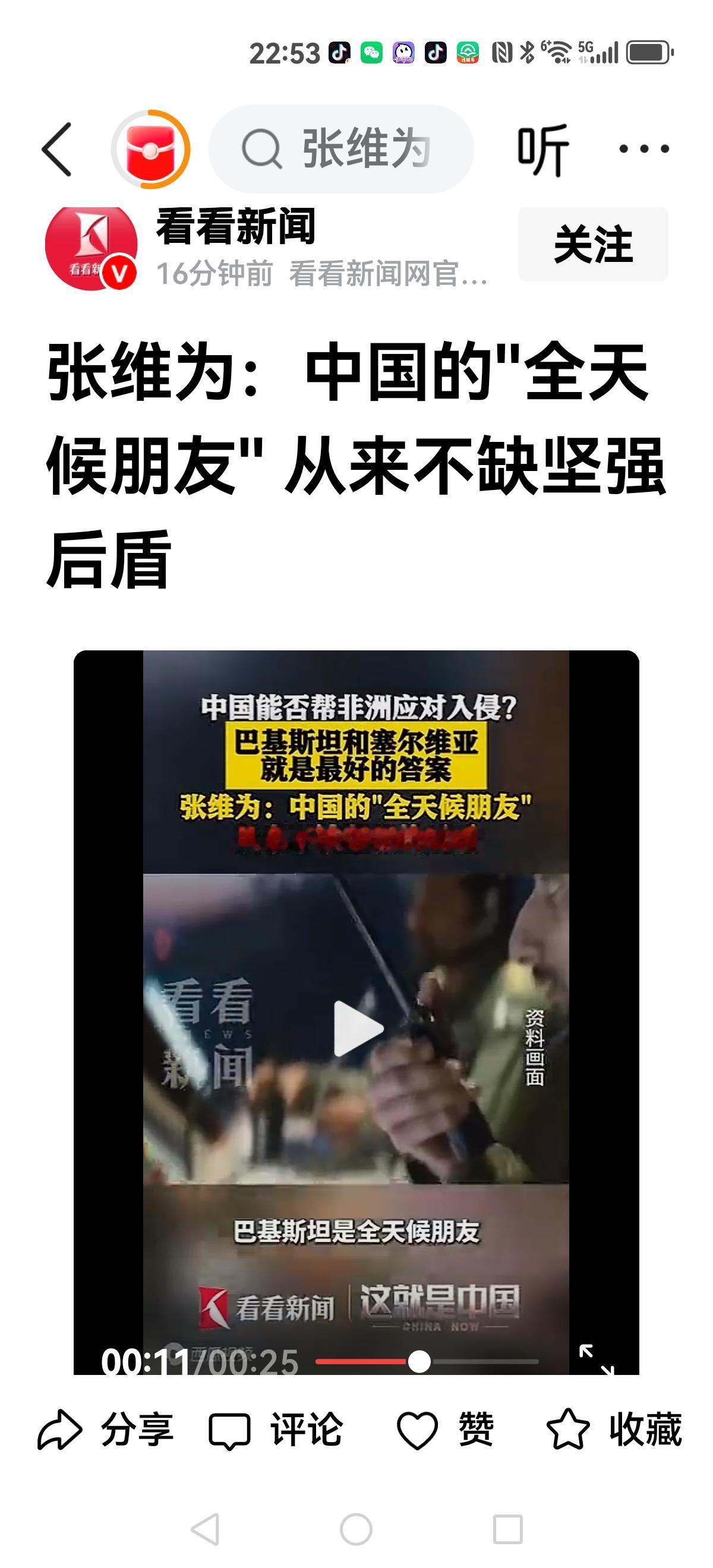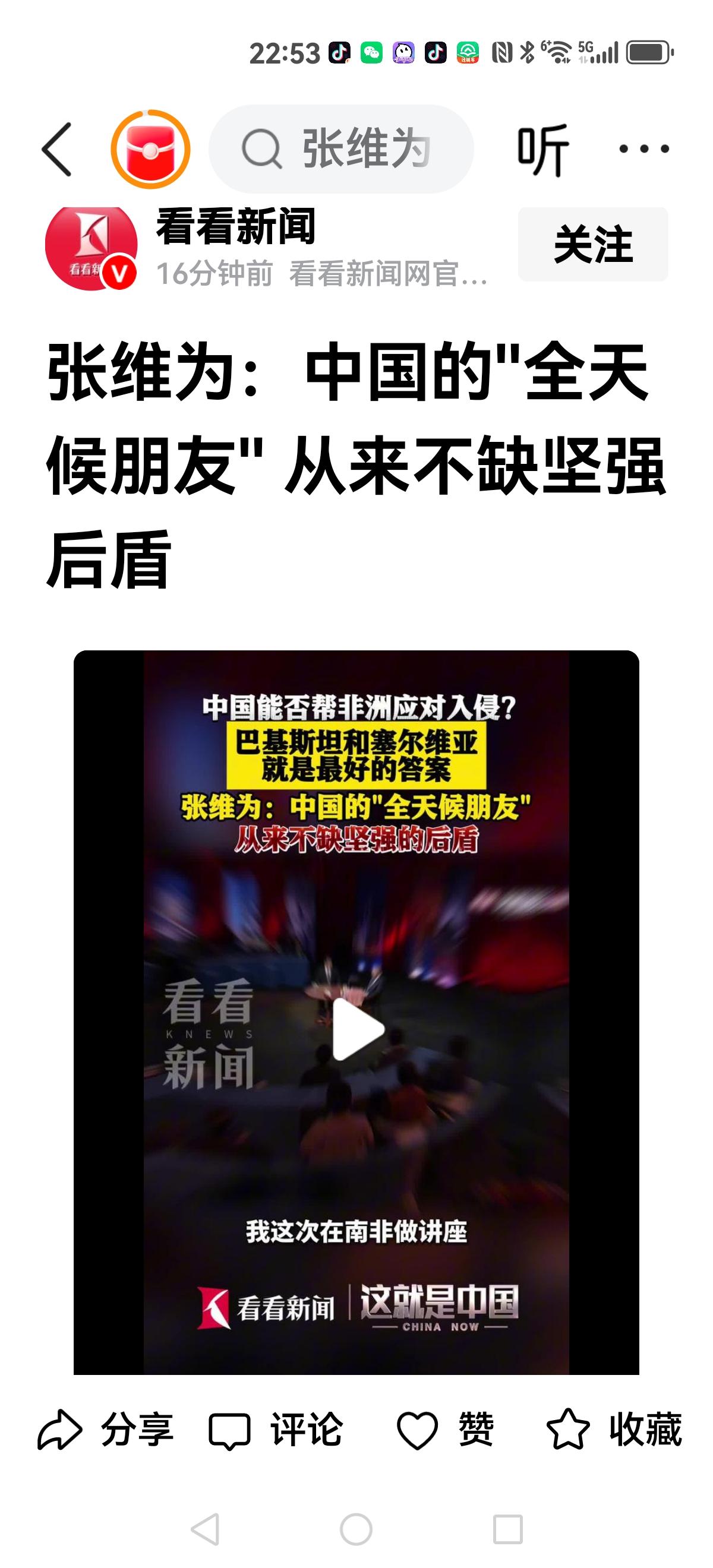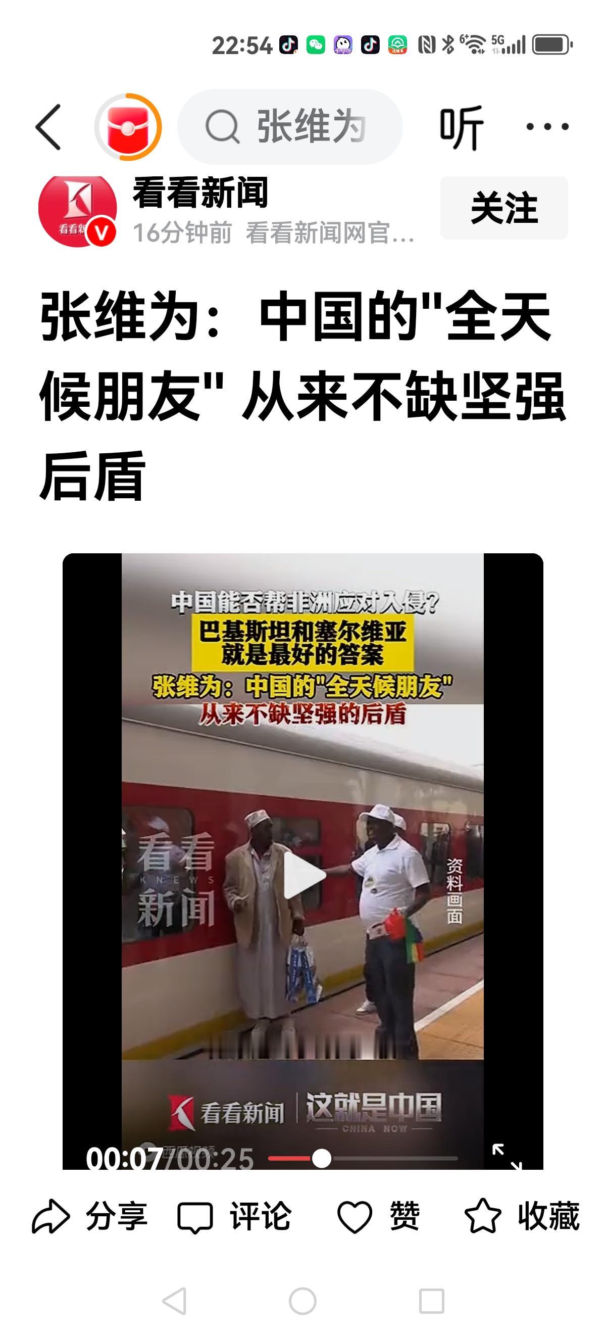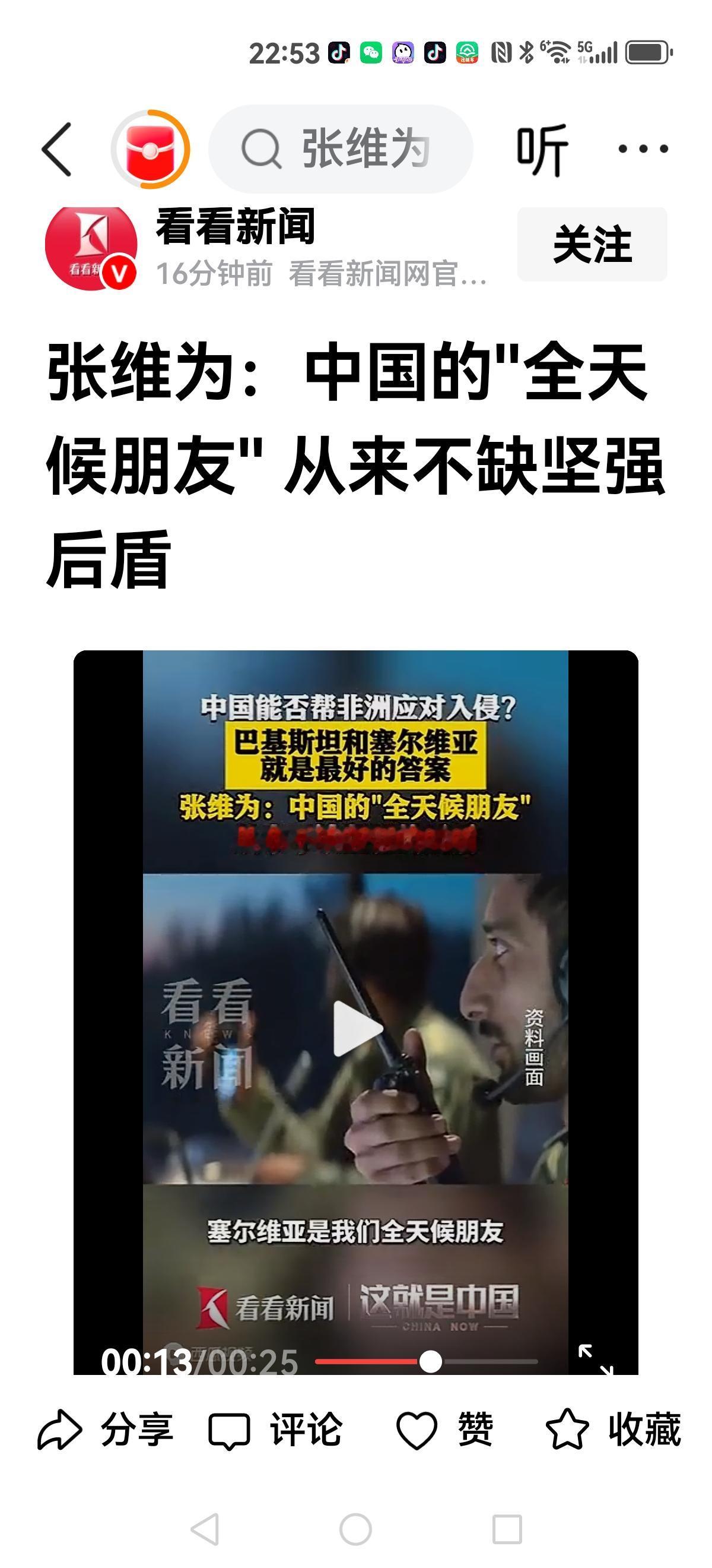 【张维为:全天候朋友】 张维为在非洲演讲,有位非洲朋友提出很尖锐问题:请问,我们很多非洲国家是你们“全天候”朋友,当我们受到入侵时候,你们会不会帮助我们? 张维为轻松化解回复到:我给你举两个例子,一个是巴基斯坦是我们“全天候”朋友,他遇到麻烦,我们给了多少武器,从此没有人敢欺负他,另外一个塞尔维亚,也是受到委屈,有人欺负他,结果我们送去了先进武器,美国不再敢炸塞尔维亚。 看来想做“全天候”朋友,我们就是坚强后盾,看来“全天候”很重要,是救不救的先提条件。 看来各个国家都要争夺我们的“全天候”朋友?